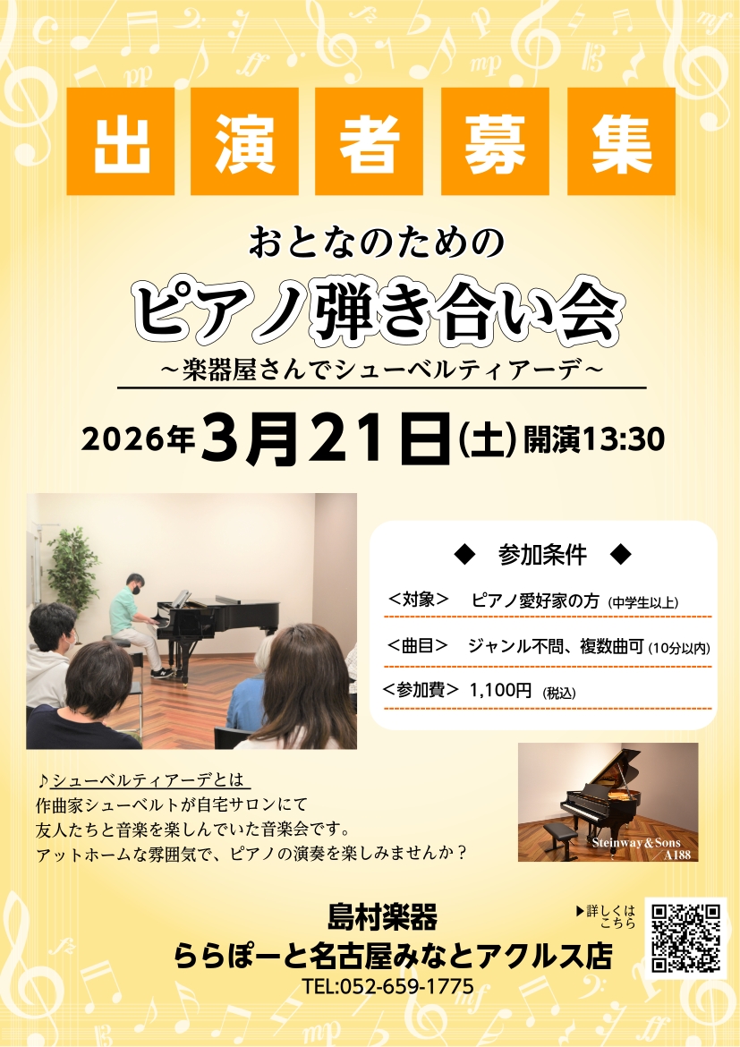 【イベント情報】2026年3月21日(土)開催 おとなのためのピアノ弾き合い会~楽器屋さんでシューベルティアーデ~
