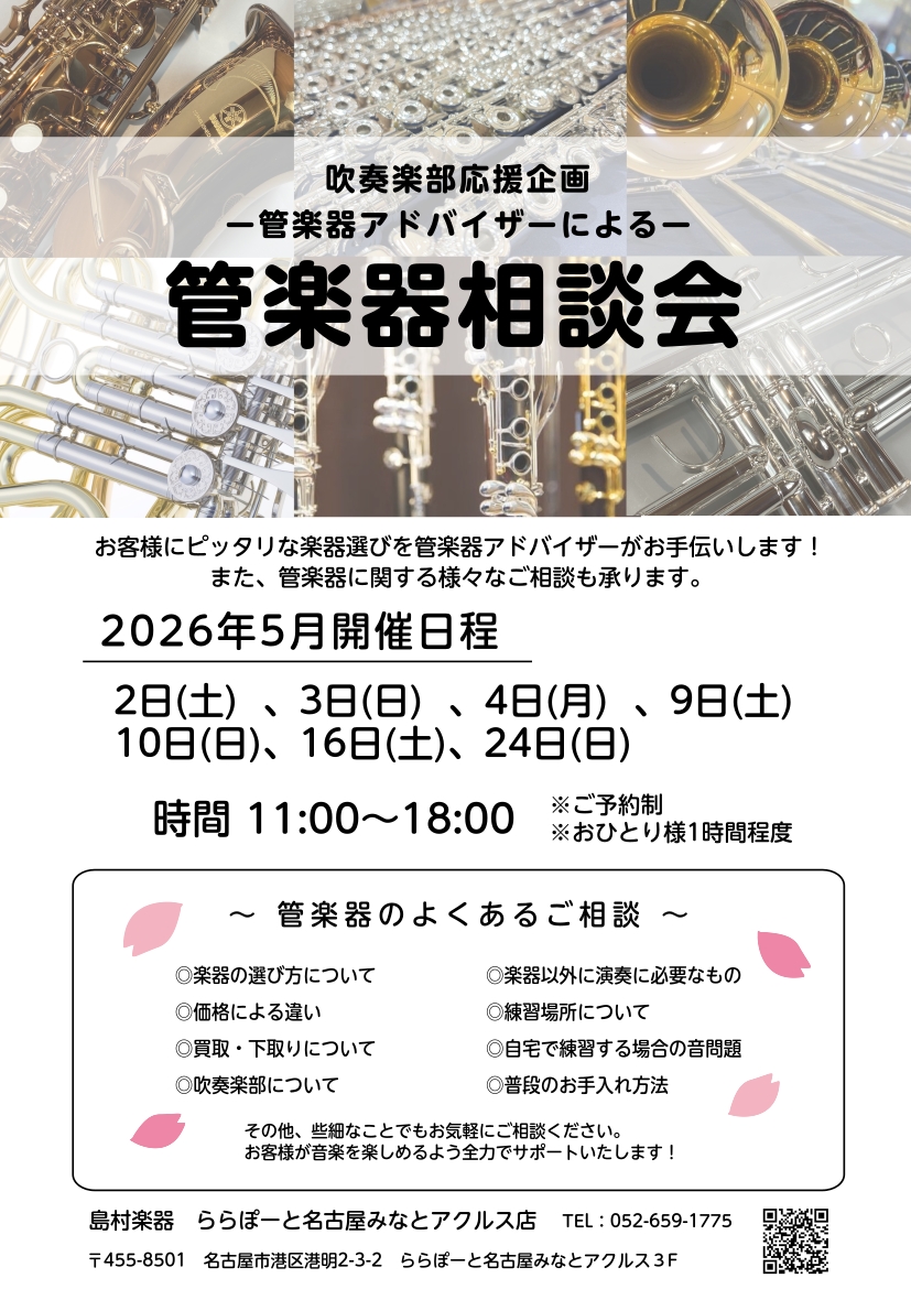 ![CONTENTS吹奏楽部の新入部員も大歓迎!吹奏楽部の新入部員も大歓迎! ららぽーと名古屋みなとアクルス店では、管楽器が初めてという方にオススメの入門機種や、吹奏楽部での人気機種、通常は店頭に無い受注生産の稀少モデルまで、幅広いラインナップを取り揃えております。 お客様の管楽器選びを当店の管楽器アド […]](https://www.shimamura.co.jp/shop/nagoya-aquls/wp-content/uploads/sites/186/2026/04/20260427-762b3250e2c99dc0949040fc3c759cd1.jpg)