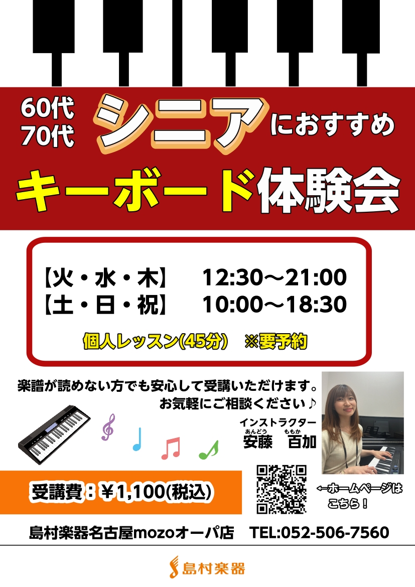 ![60代・70代からの新しい趣味!『はじめてのキーボード体験会』開催します♪ 音楽を楽しむのに「遅すぎる」なんてことはありません。この体験会は、これからキーボードを始めてみたい方や昔ピアノを弾いていた方など、どなたでも気軽に音楽を楽しめる内容です。楽譜が読めなくても大丈夫!1曲弾ける体験を通して、音楽 […]](https://www.shimamura.co.jp/shop/nagoya-mozo/wp-content/uploads/sites/193/2025/10/20251019-shima251019-0044.jpg)