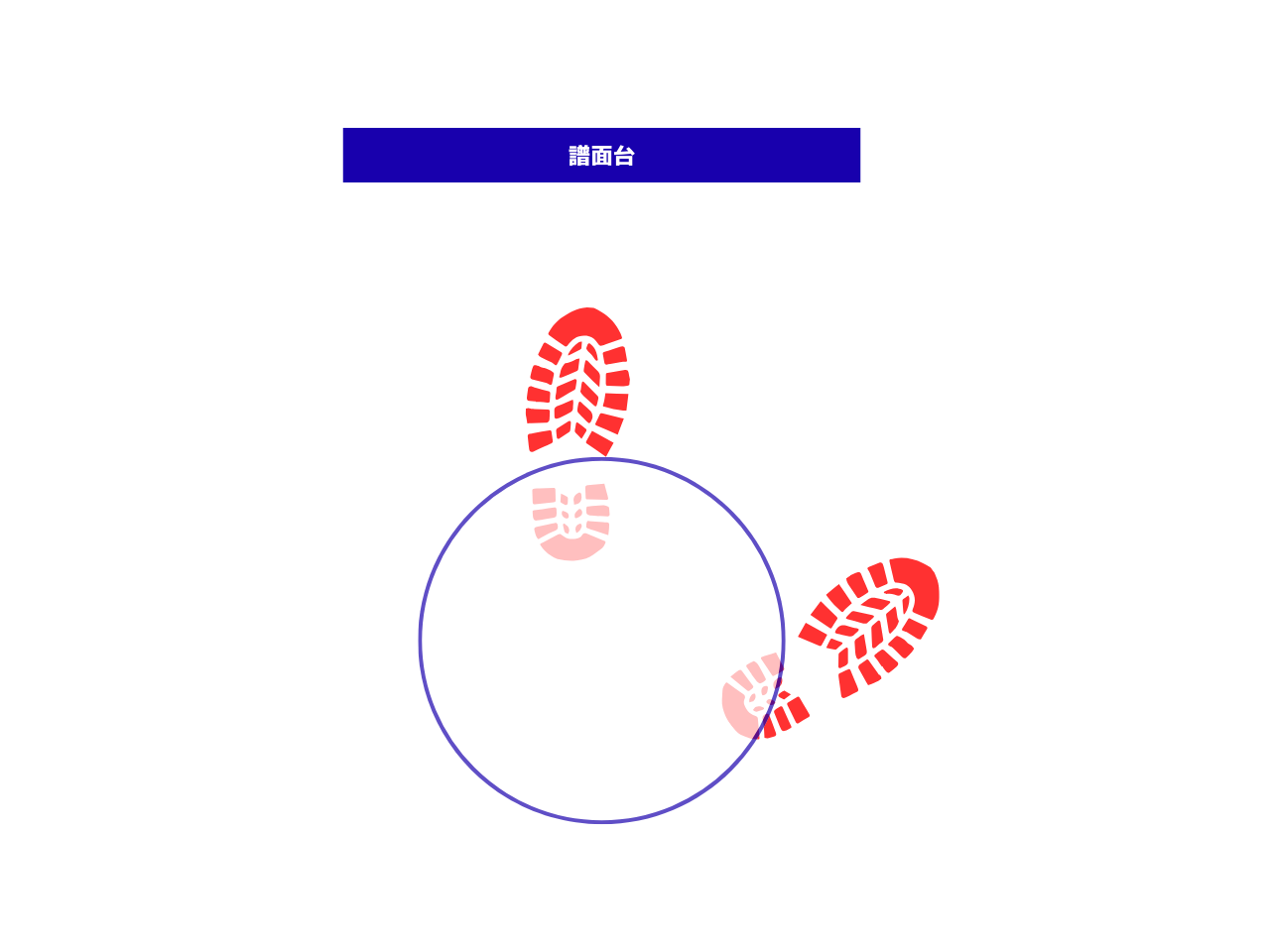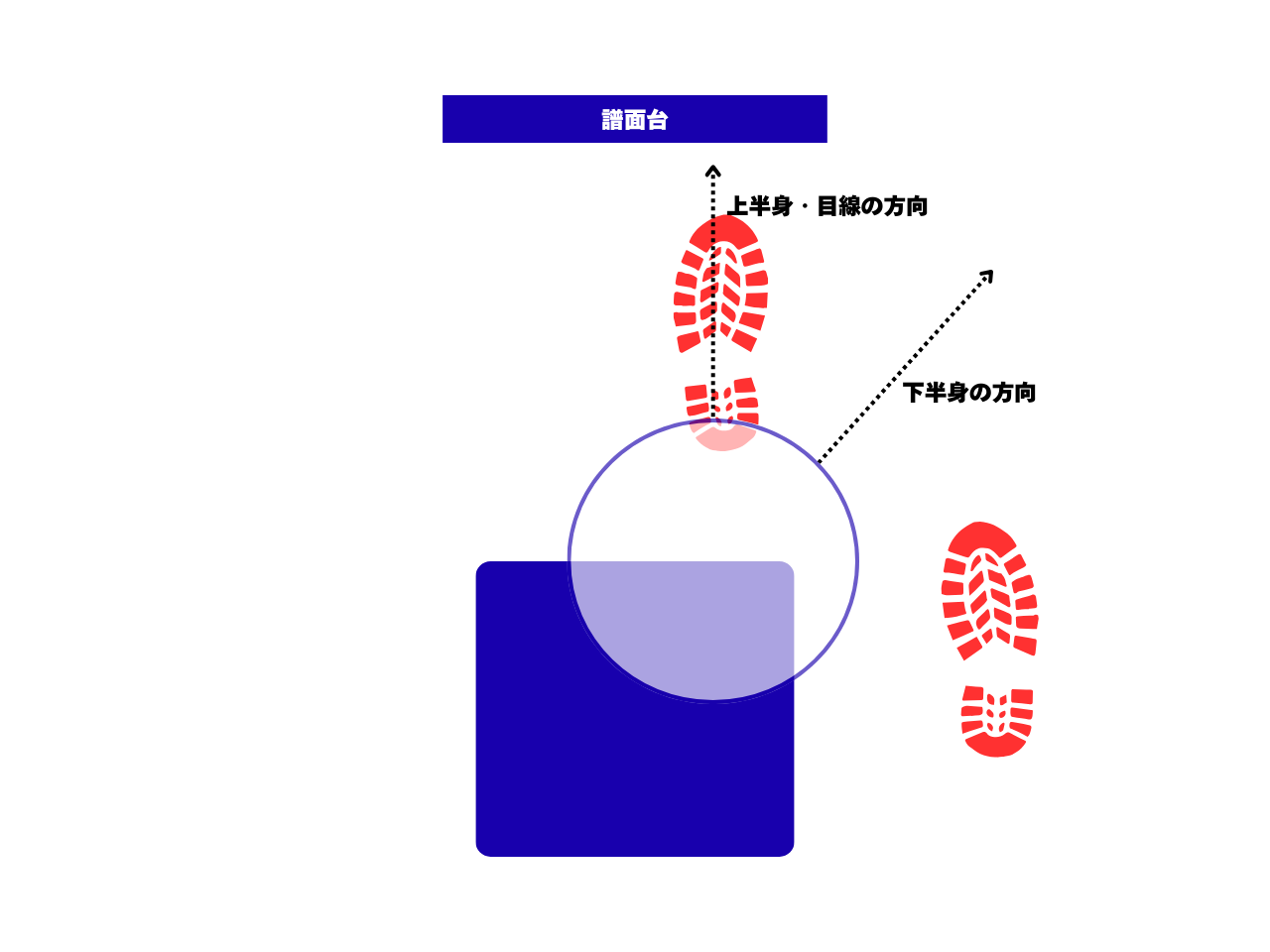 足の位置:譜面台に対しておおよそ右斜め45度に。肩幅に開き、左足を前に出す。この時に重心が両足バランスよくかかるようにしましょう。
