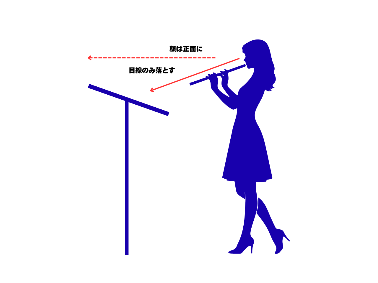 譜面台は顔と同じ高さ・角度を縦にまっすぐにはしないでください。これは座奏でも立奏でも同じです。