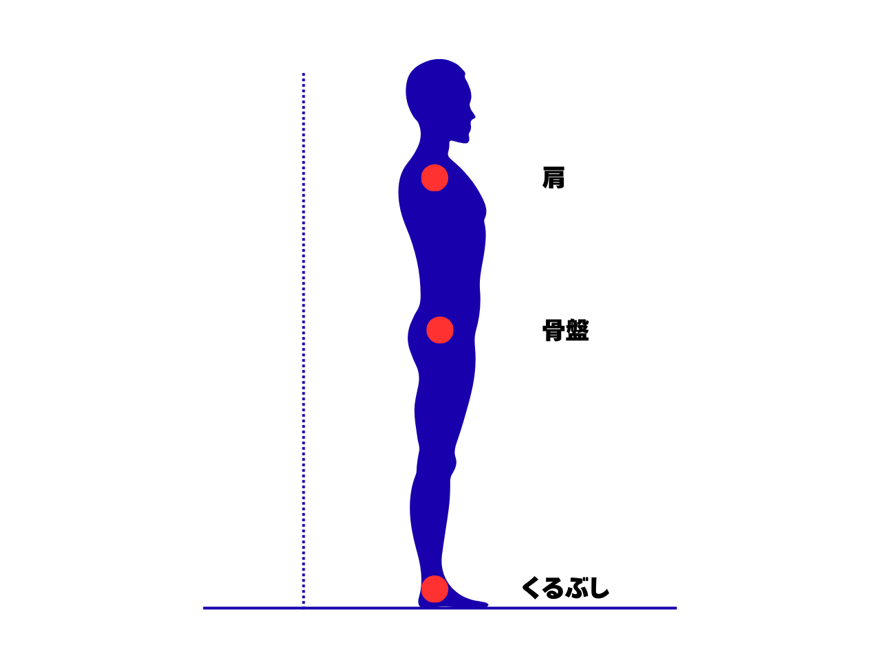 基本的な身体の軸:くるぶし・骨盤・肩が床から垂直になるようまっすぐ立ちます。