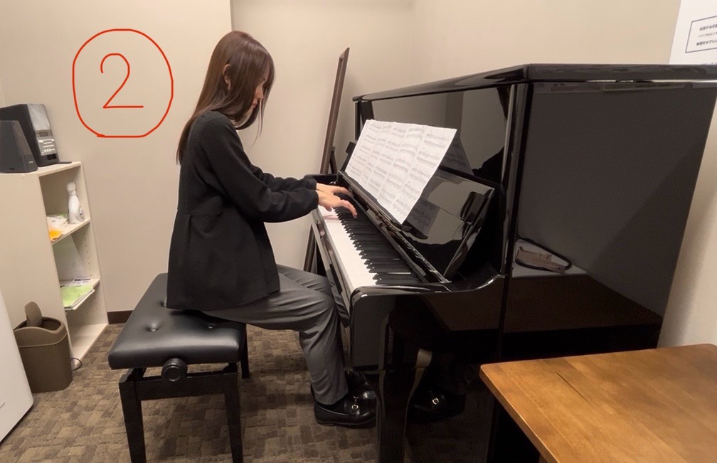 下記の写真を見ていただいて、①が高音を弾くために右側に重心が移動している様子です。