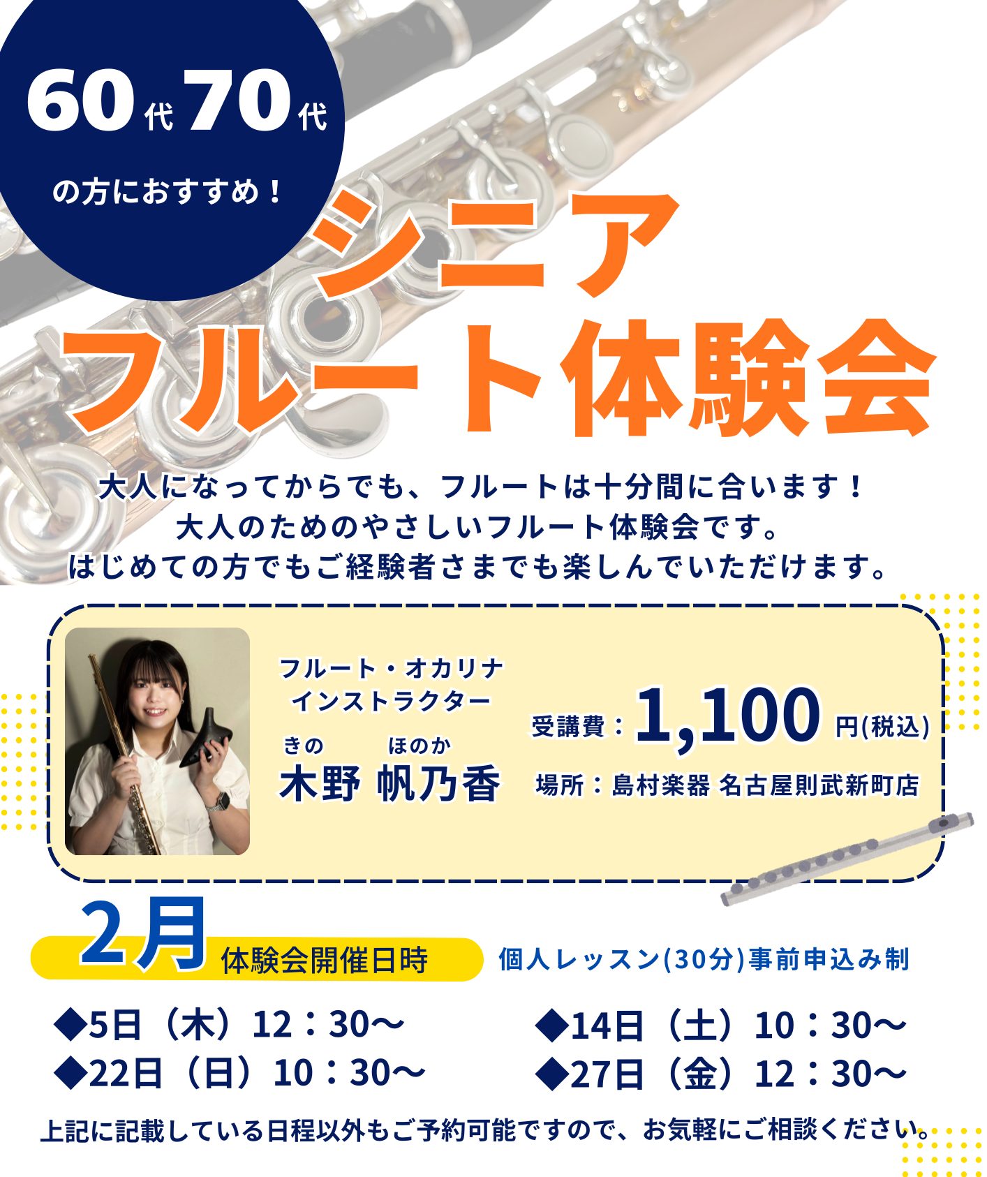 ![皆様こんにちは!島村楽器 名古屋則武新町店フルートインストラクターの木野です。「フルートに憧れていたけれど、今からじゃ遅いかな…」と思った方はいらっしゃいますか?そんな60代・70代の方のための、やさしいフルート体験会です。大人になってからでも、フルートは十分間に合います。60代・70代から“フルー […]](https://www.shimamura.co.jp/shop/nagoya-noritake/wp-content/uploads/sites/202/2025/12/20251218-e92512132610dd098d357f2155bf891a.jpg)