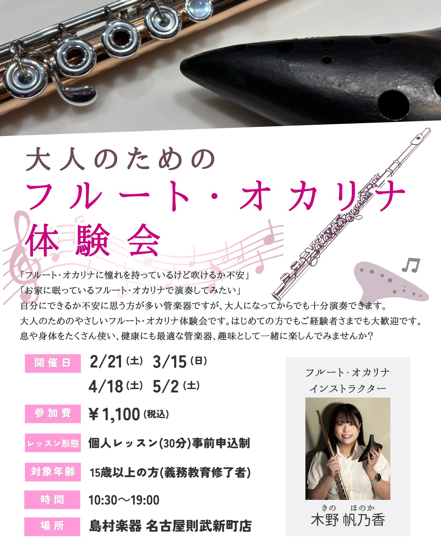大人のフルート・オカリナ体験会を開催します!名古屋市西区 中村区 名駅エリア