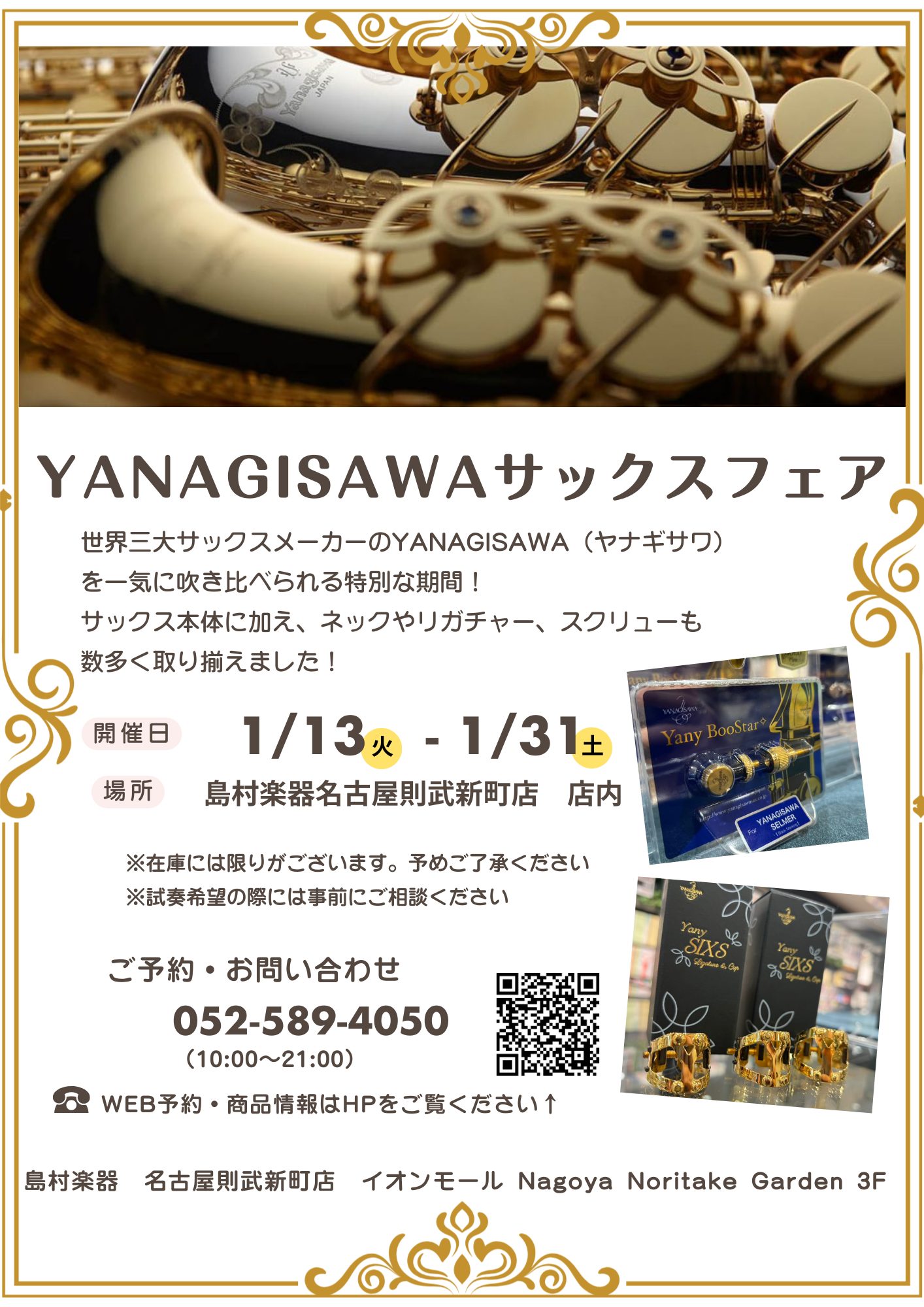 ![みなさま、こんにちは!YANAGISAWAのサックスを愛してやまないゆきまるです。 今回は、店頭でなかなかお目にかかれなくなったYANAGISAWA(やなぎさわ)のサックスを可能な限り店頭に集めてみました!是非、この機会に試奏してMY楽器として手にしてみてはいかがでしょうか! CONTENTSYAN […]](https://www.shimamura.co.jp/shop/nagoya-noritake/wp-content/uploads/sites/202/2026/01/20260106-20240425-h2-history-1536x438-1.jpg)