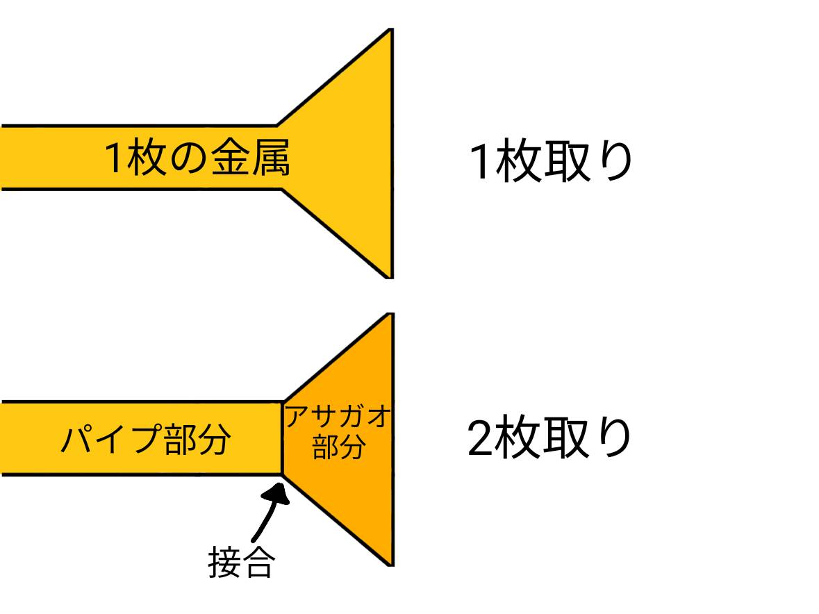 2枚取り→パイプ部分とアサガオ部分の金属を接合して製作しています。機械で製作するのでバラつきが少なく安定した品質、