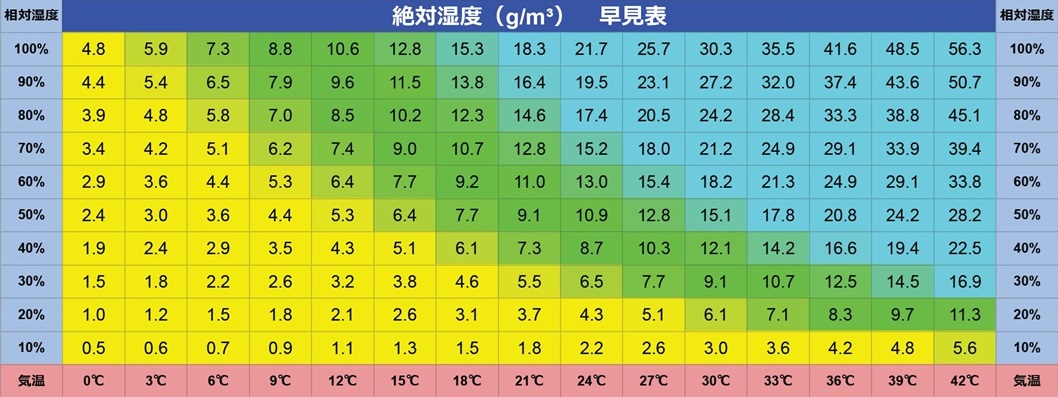 ①絶対湿度は、10g/m³前後、大体8~12g/m³を目指す。