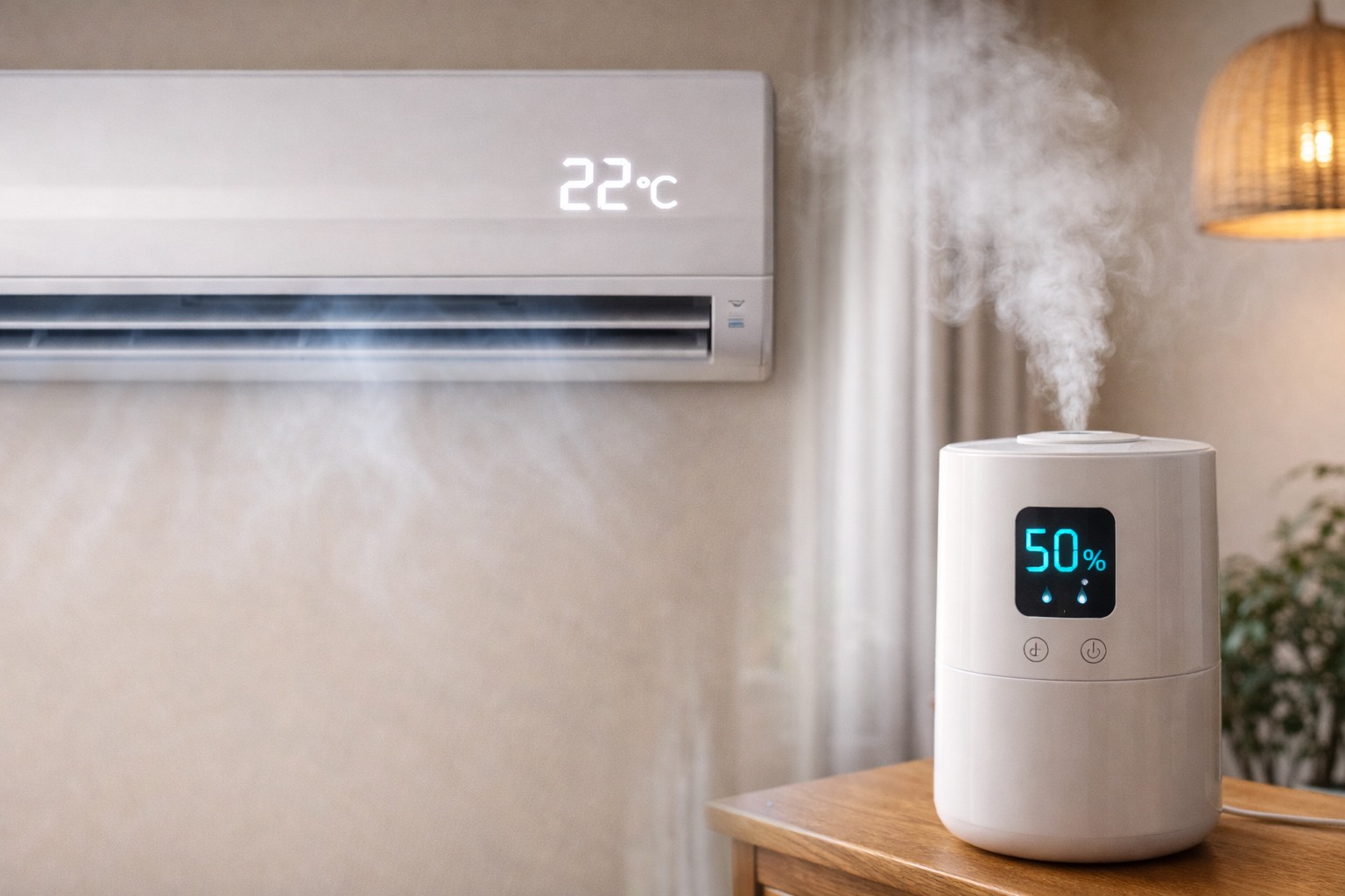 エアコンで部屋の温度を22℃に設定して、加湿器を50%の設定で稼働させてください!