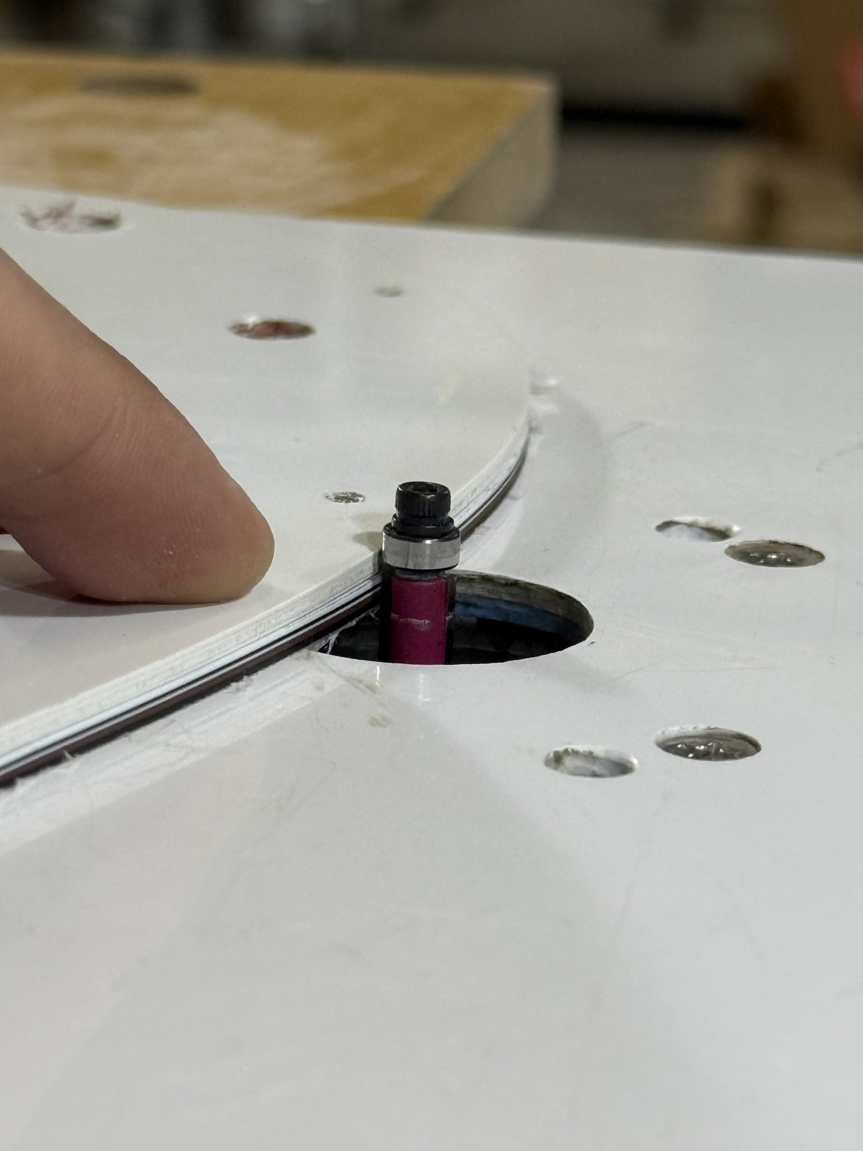 次にトリマーという機械にセット。刃物の上部にベアリングが付いていて、それが超高速で回転するという仕組みです。