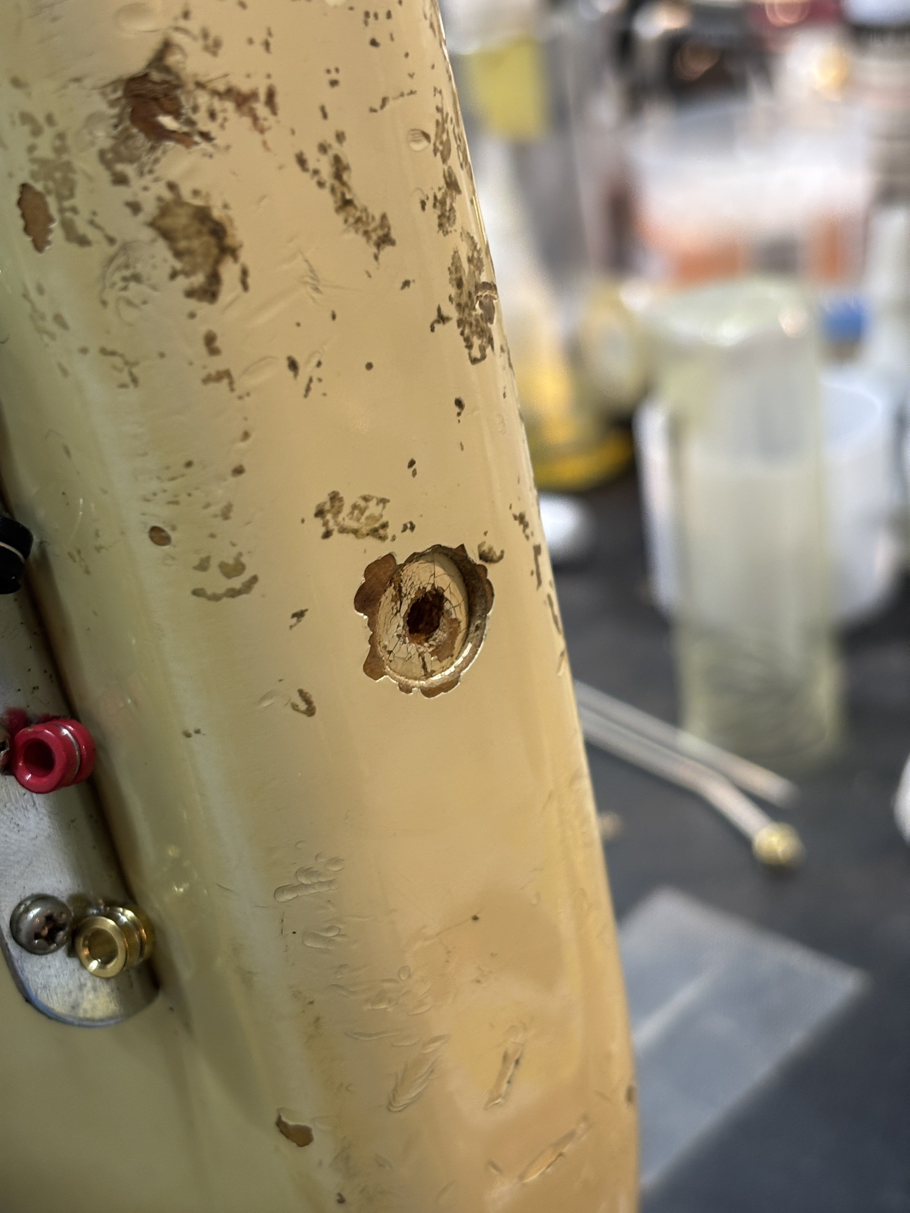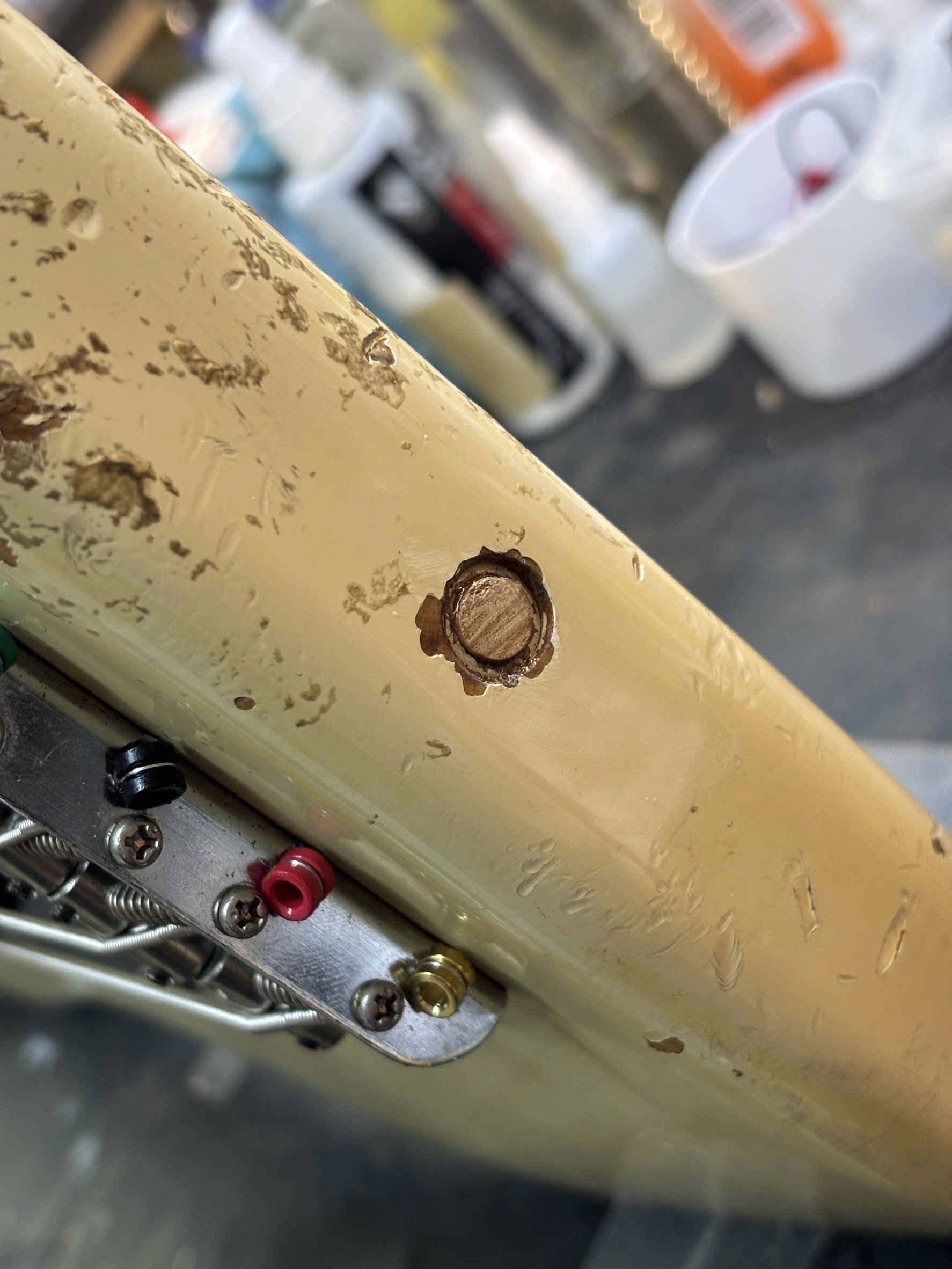 この楽器はボディ材が非常に柔らかく、ねじ穴が崩壊している部分がありました。