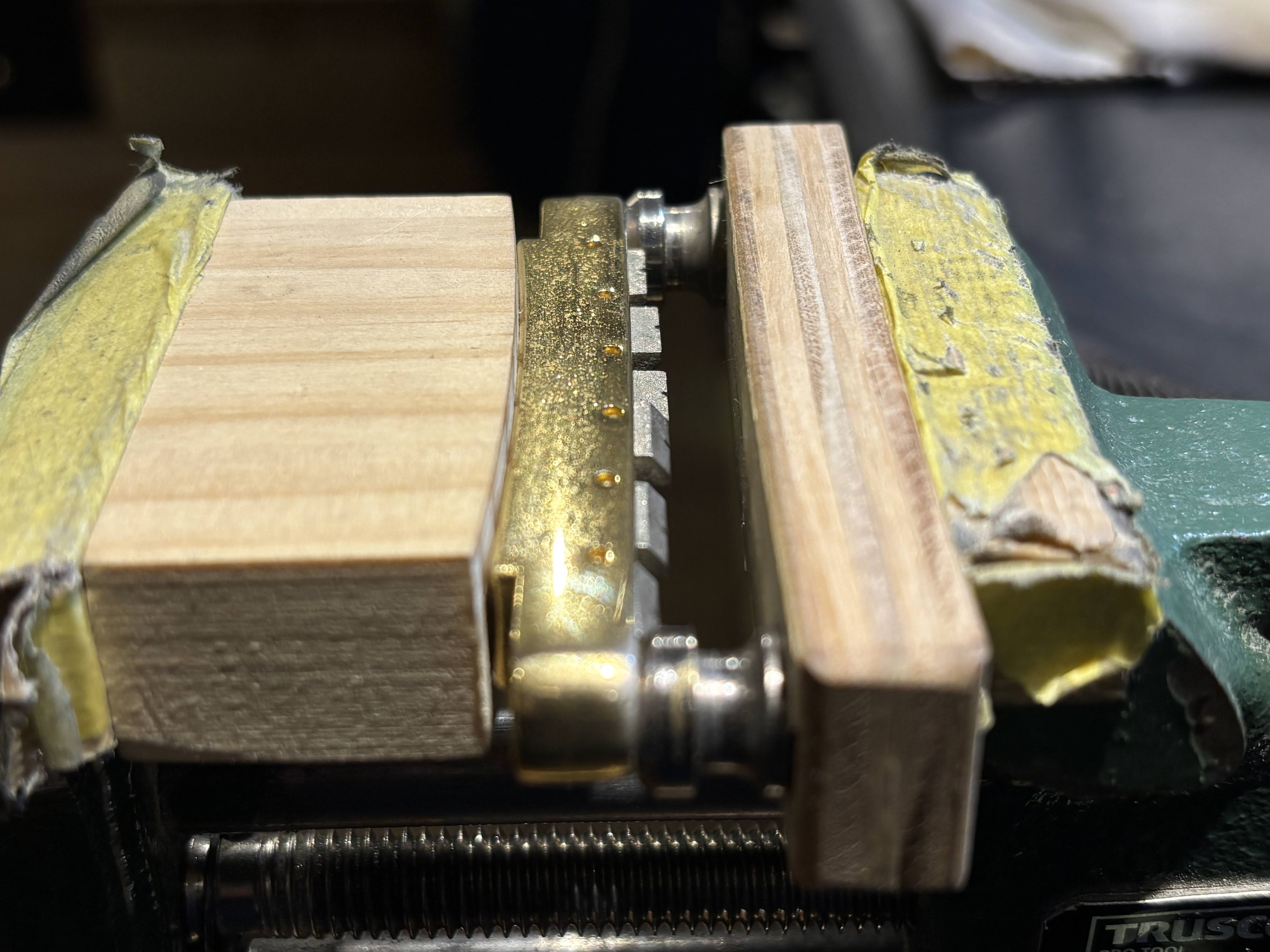 叩くと部分的に曲がってしまい、最悪割れる場合もある為、万力を使って修正していきます。