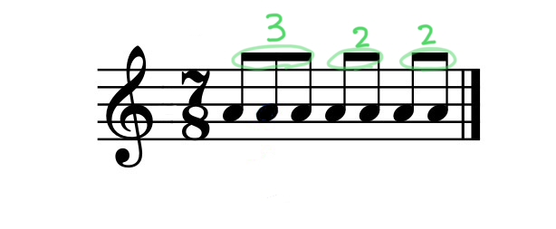 「どこを見たら数え方が分かるの?」と思うかもしれませんが、実は楽譜の「音符をつなぐ棒(連桁(れんこう))」を見れば一目瞭然です。下の画像のように、3つ、2つ、2つの塊で分かれているのが分かりますよね。この「塊」を意識するだけで、難しい変拍子もぐっと演奏しやすくなりますよ!