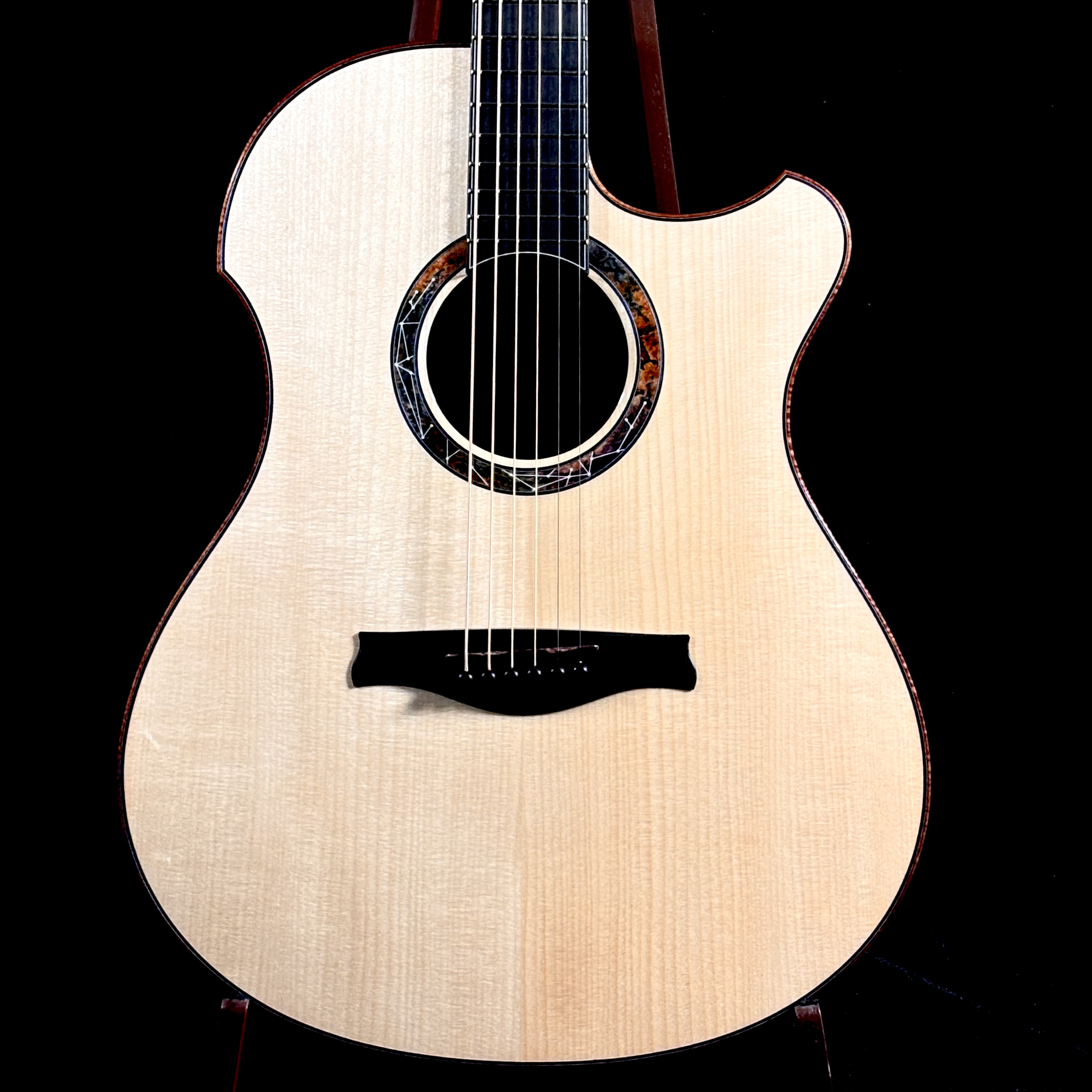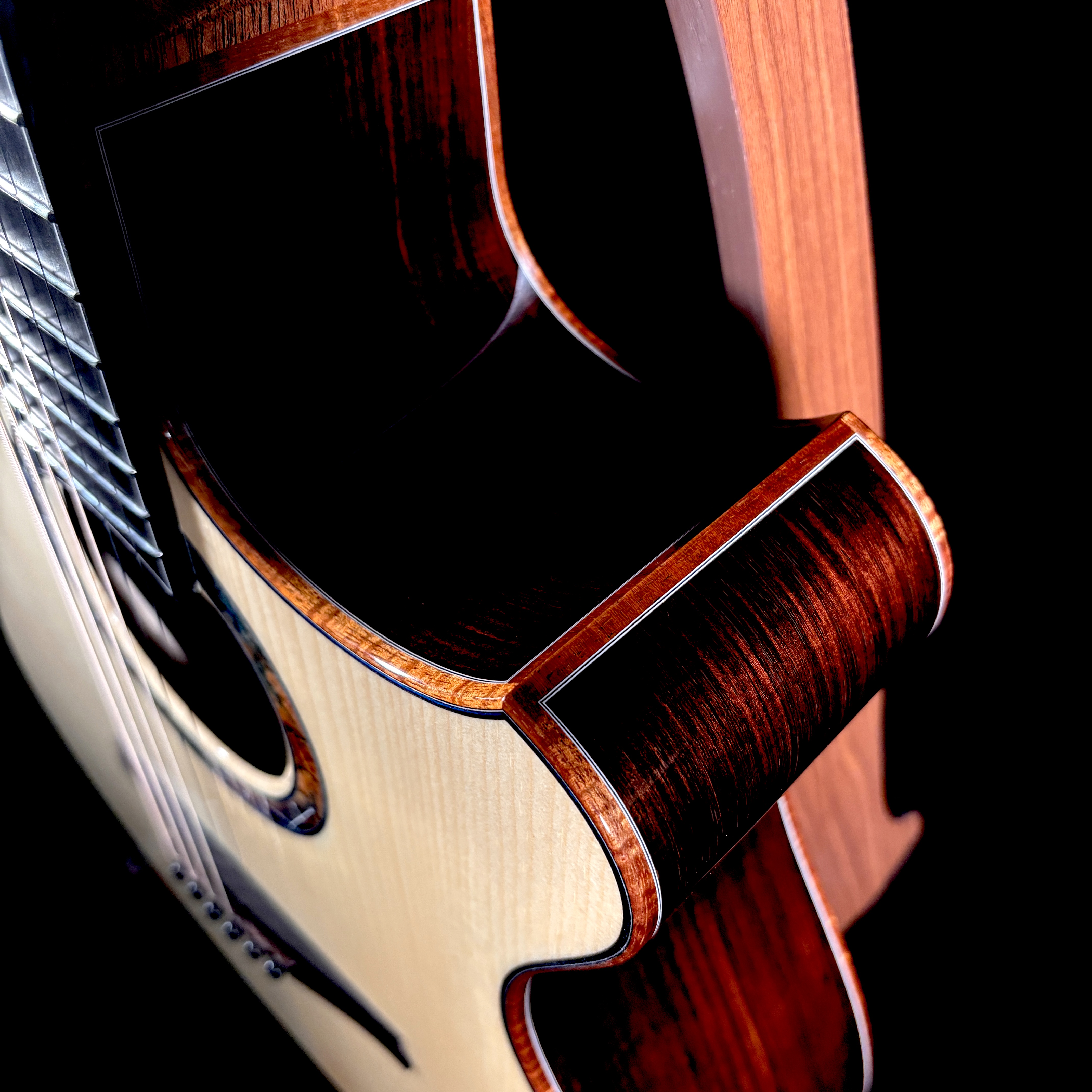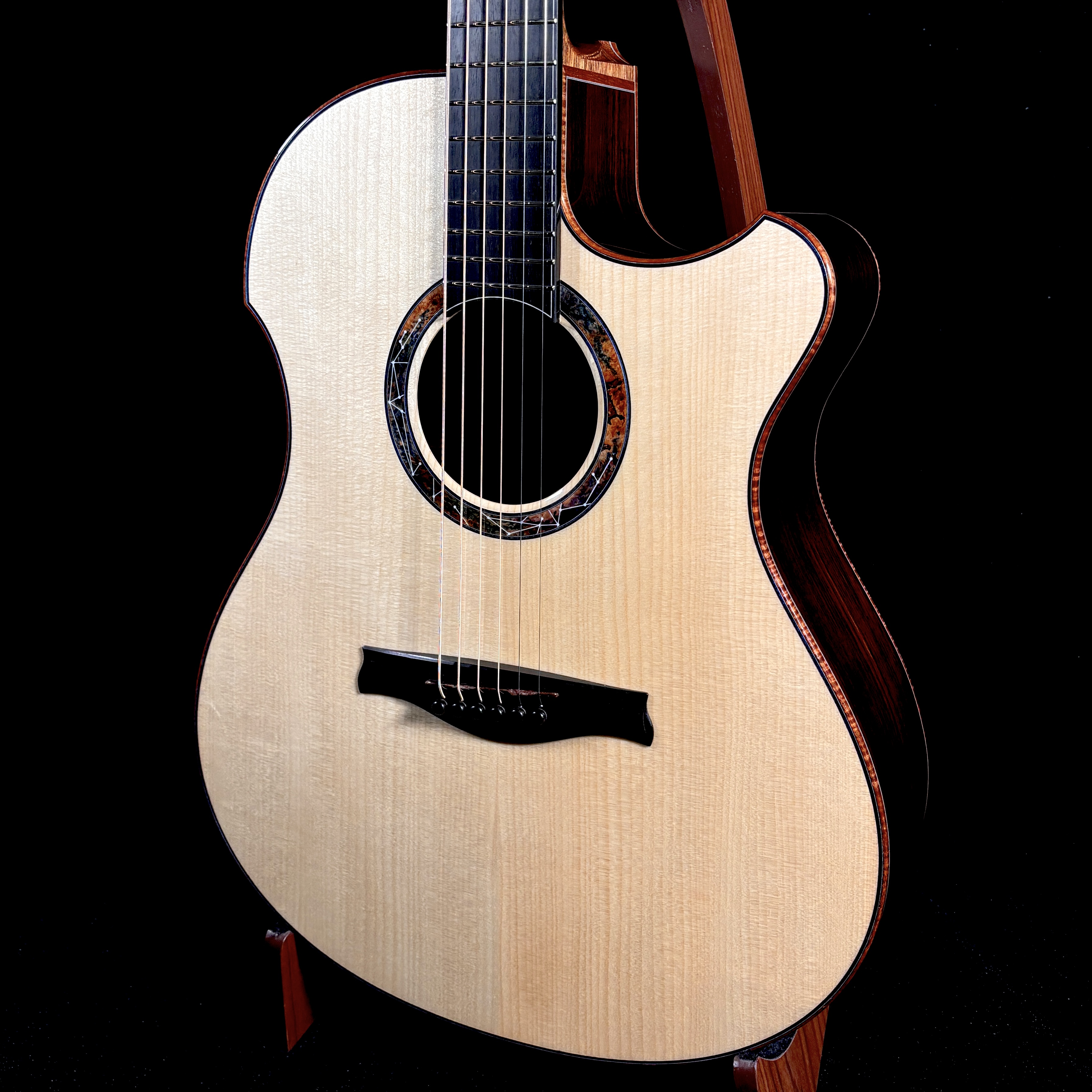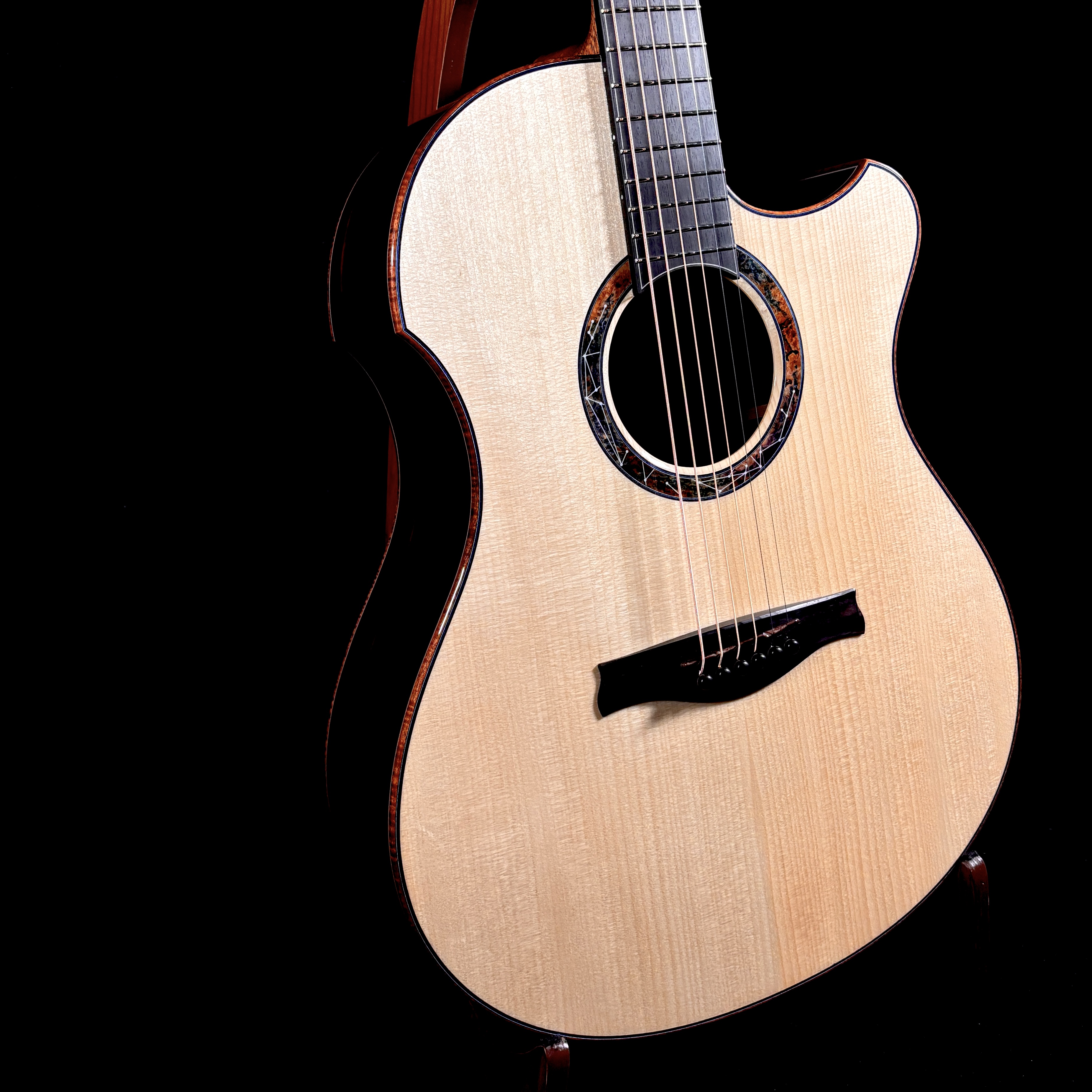 艶やかな外観を彩るのは、多色バールによる芸術的なロゼッタとヘッドプレート。カーリー・ハワイアンコア・バインディングが全体を包み込み、見るたび弾くたびに心を満たすプレミアムな存在感を放ちます。