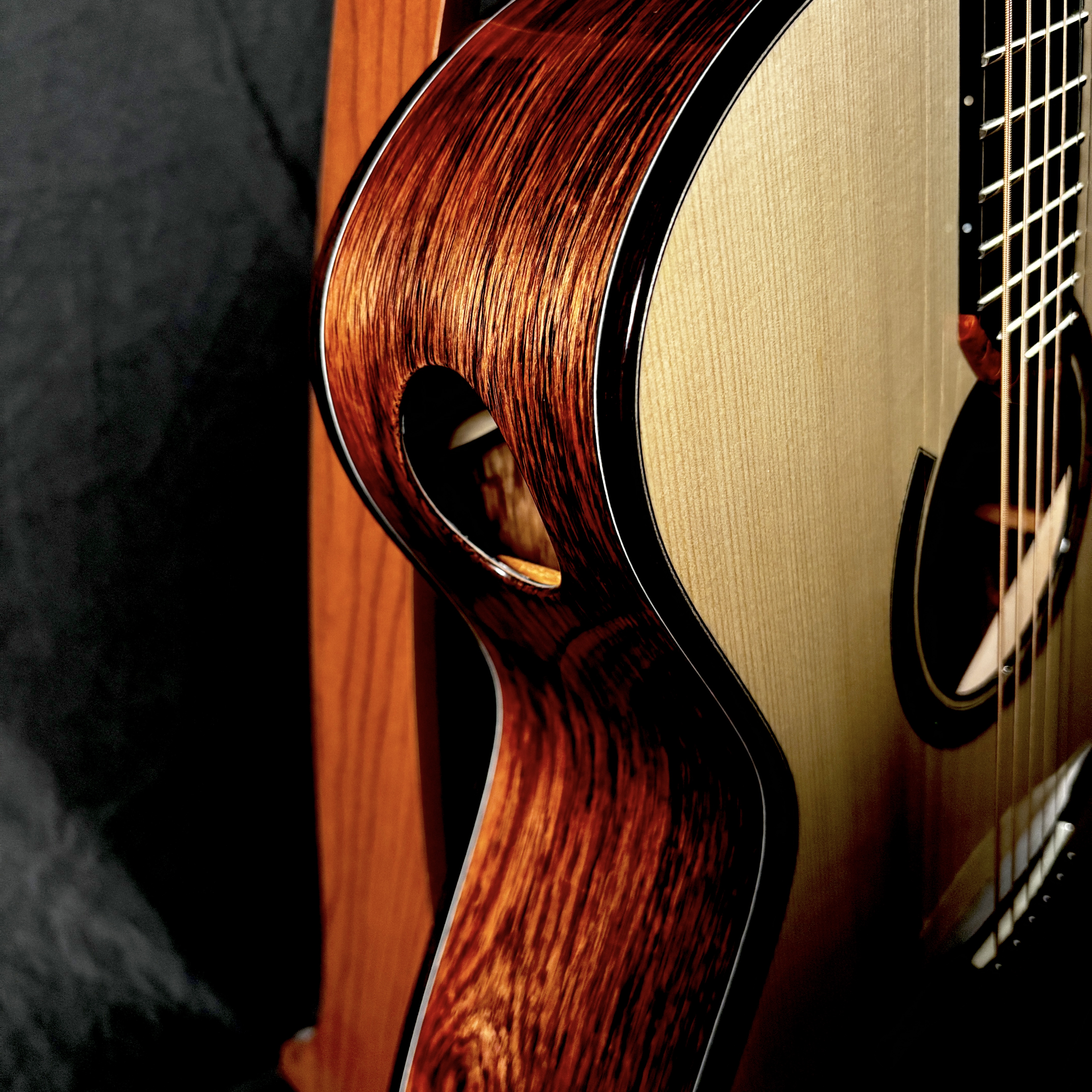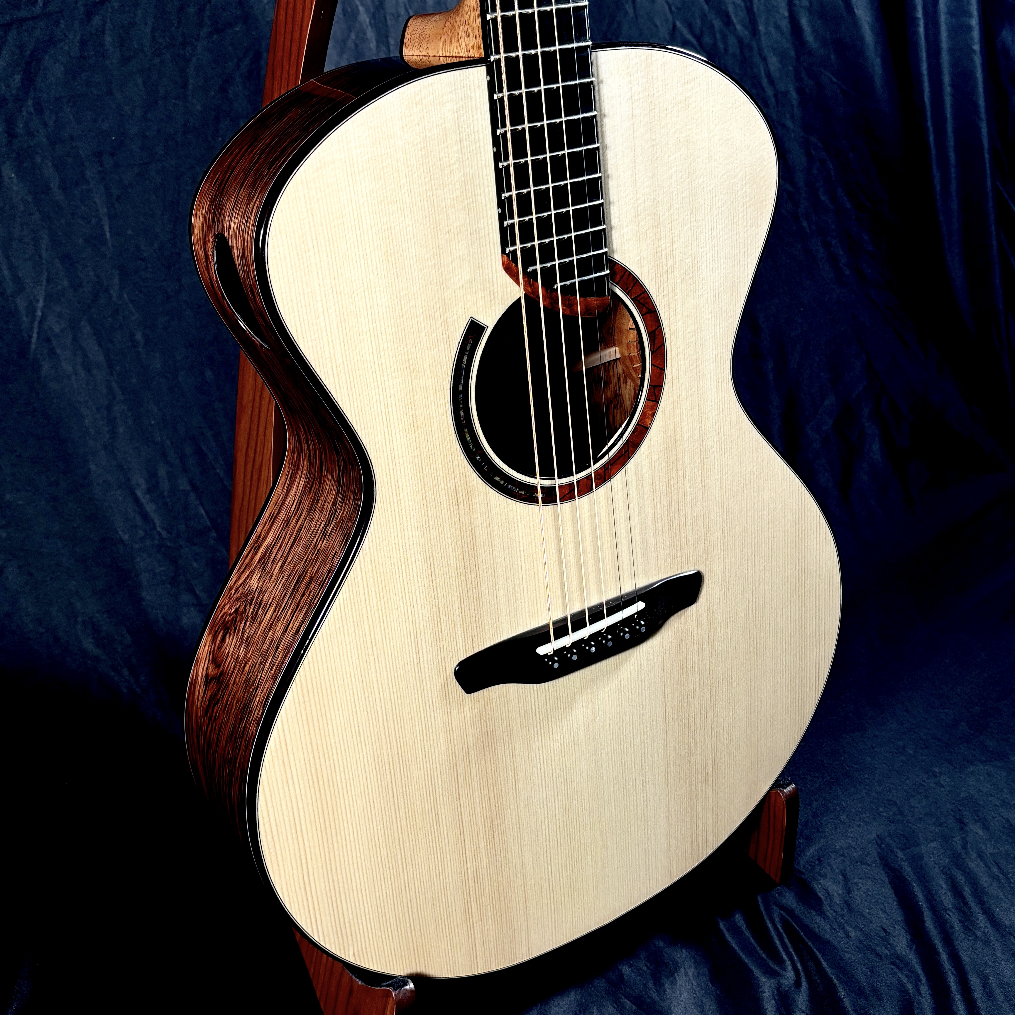 Hatsune OM IS/HRは、クラシカルなOMフォルムに林氏独自の音響理論を融合させたモデルです。トップにはアルプス山麓産イタリアン・スプルース単板、サイド&バックには銘木ホンジュラス・ローズウッド単板を採用。 透明感あふれる高域と、低域の深い余韻、それらを自然に調和させるオリジナルXブレーシング構造が、表現者のあらゆる指のニュアンスに忠実に反応します。 弾き手の感情がそのまま音の立体感として現れる――まさに“音が呼吸する”ギターと呼ぶにふさわしい逸品です。