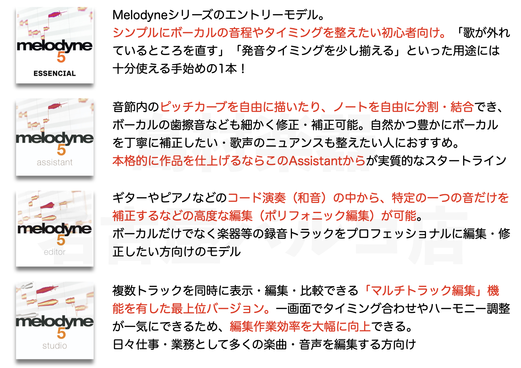 Essential/Assistant/Editor/Studioと全部で4グレードあるMelodyne。