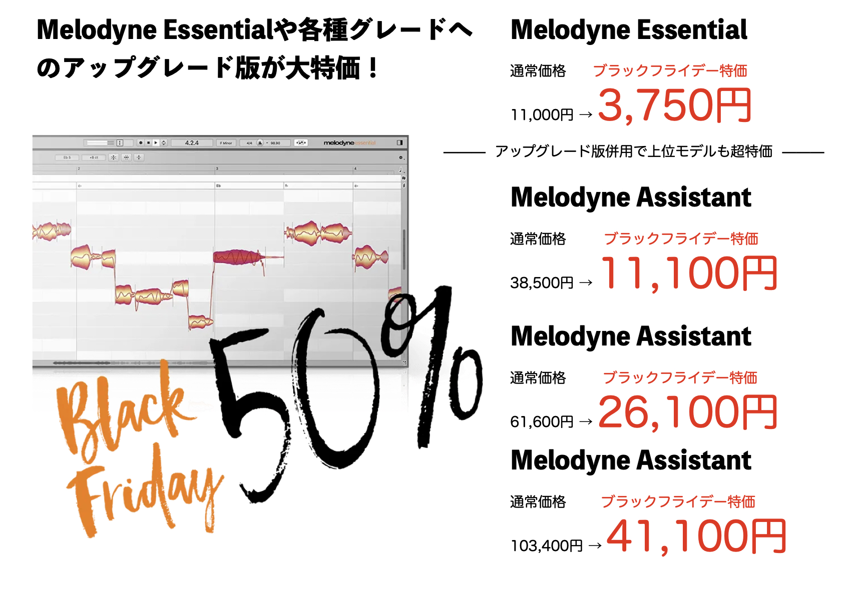 なんと、音楽クリエイターにはお馴染みのCelemony社の定番ピッチ補正ソフトMelodyneが大特価となるブラックフライデーセールがスタートしました!