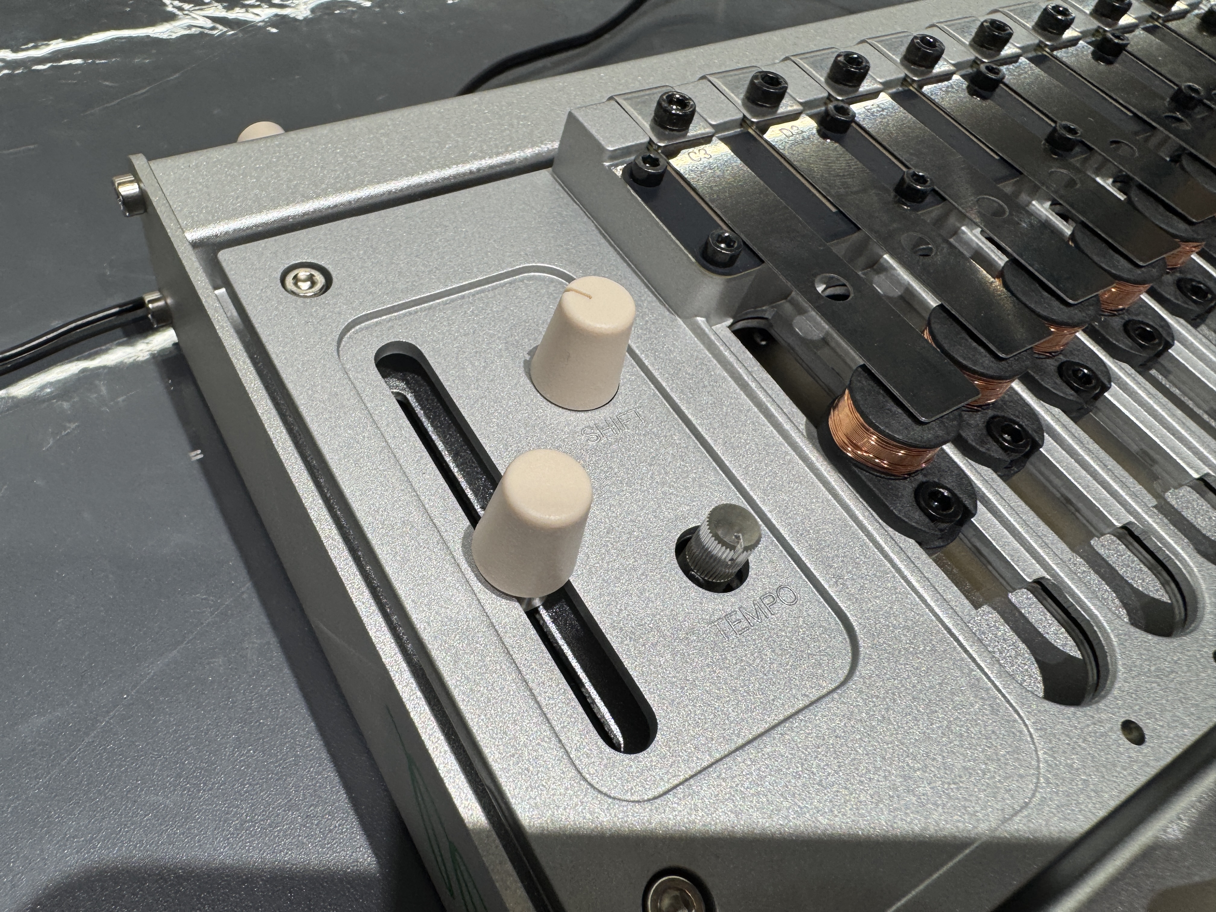 このスライダーを上げればレゾネーターやピックアップからの音は常に聞こえる状態になり、金属部分を手で触れることで音を鳴らすこともできます。