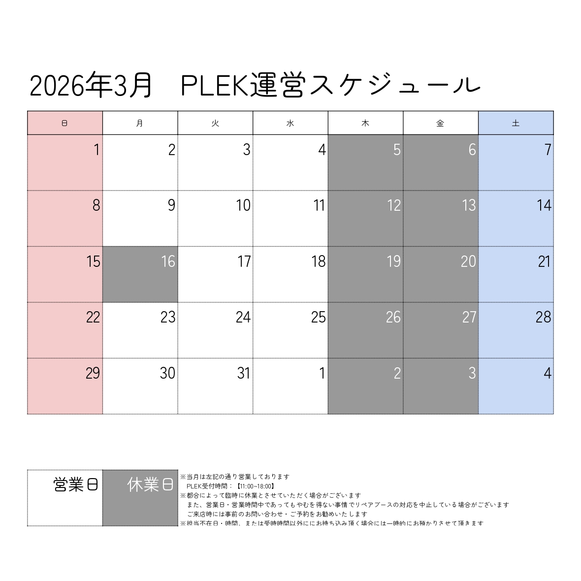 ・木・金曜日定休(一部例外ありの為、詳細については当店までお問い合わせ下さいませ。)