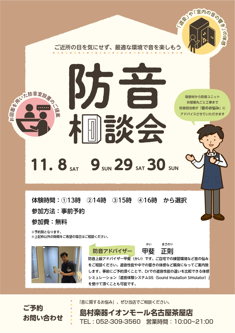 ![CONTENTS防音相談会を開催します!防音相談会詳細防音体験も随時可能です防音アドバイザー紹介防音相談会を開催します! こんにちは。島村楽器イオンモール名古屋茶屋店防音上級アドバイザーの甲斐です。「家で楽器を練習したいけど、ご近所への音漏れが気になっておもいっきり練習ができない!」「音楽制作に集中 […]](https://www.shimamura.co.jp/shop/nagoyachaya/wp-content/uploads/sites/162/2025/05/20250529-20240929-20240906-7453646ce7f6aedc35ed16f0e76d30b6.jpg)