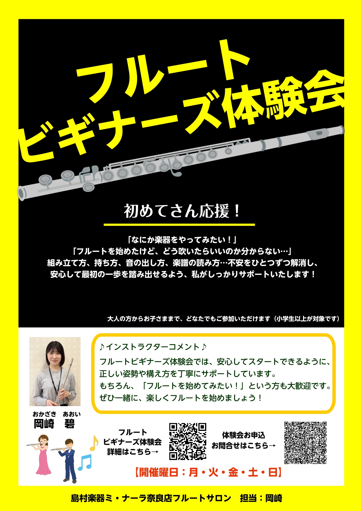 こんにちは!島村楽器ミ・ナーラ奈良店 フルートインストラクターの岡崎です!