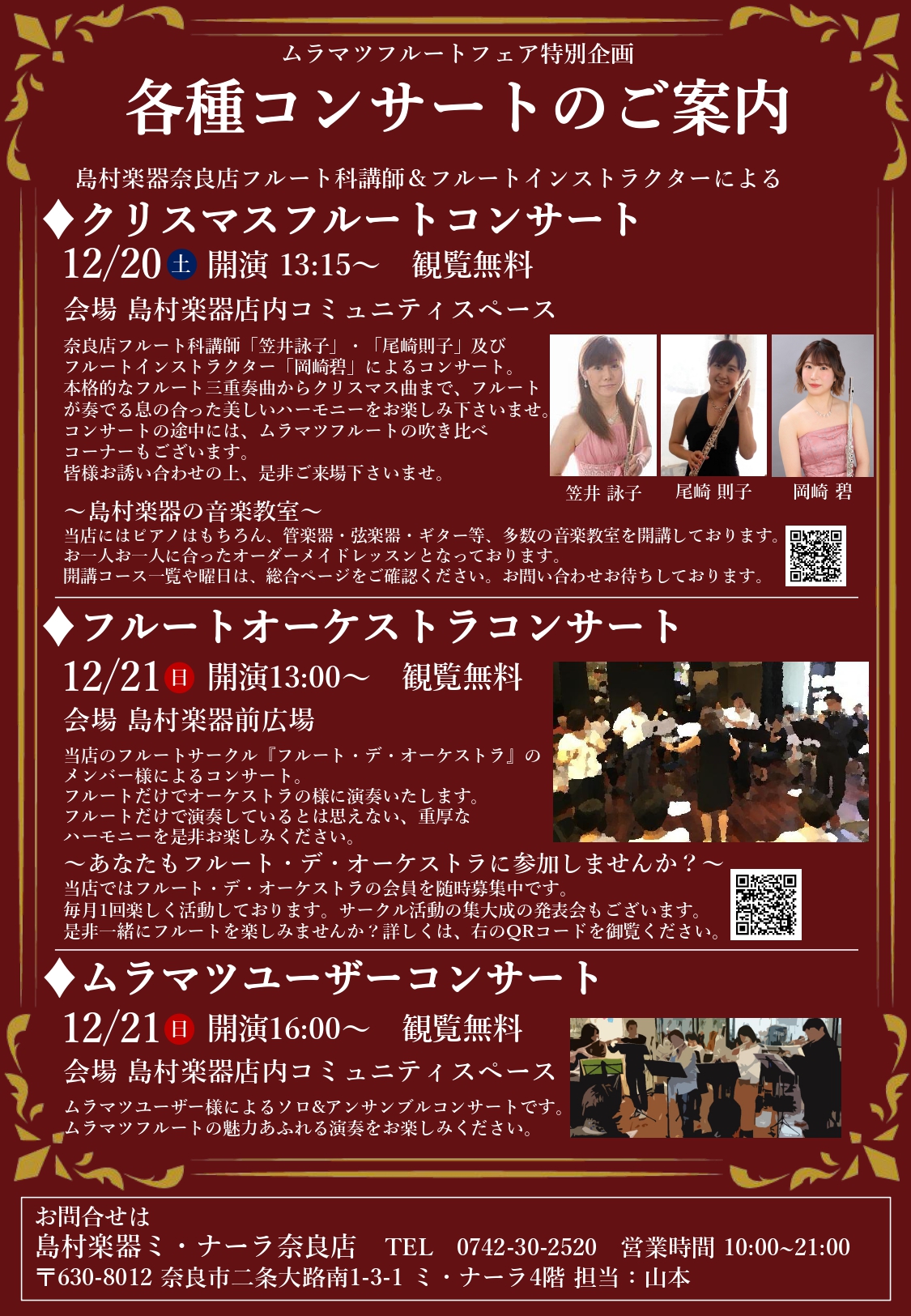 奈良店フルート科講師「笠井詠子」・「尾崎則子」及びフルートインストラクター「岡崎碧」によるコンサート。