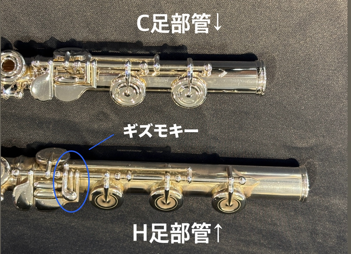 フルートには、最低音が「ド(C)」のC足部管と、半音低い「シ(H)」まで出せるH足部管があります。