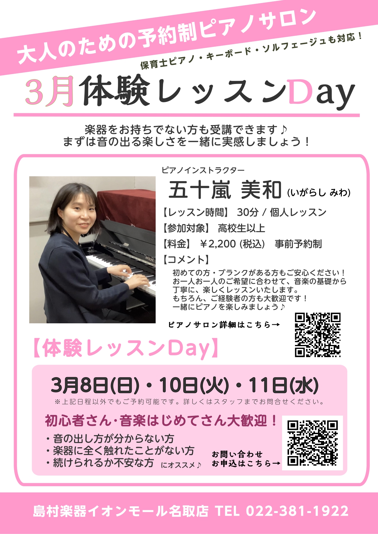 ![こんにちは!イオンモール名取店ピアノインストラクター 五十嵐です。 高校生以上の方のための予約制レッスンピアノサロンでは「体験レッスンDay」を開催いたいます!土日のおやすみの日、平日の早い時間・遅い時間も受講いただけます。受講しやすいお時間にぜひ受けてみませんか? はじめての方も、久しぶりに再開さ […]](https://www.shimamura.co.jp/shop/natori/wp-content/uploads/sites/112/2026/02/20260203-61b067fafc488668953988b7ec811ce5.jpg)