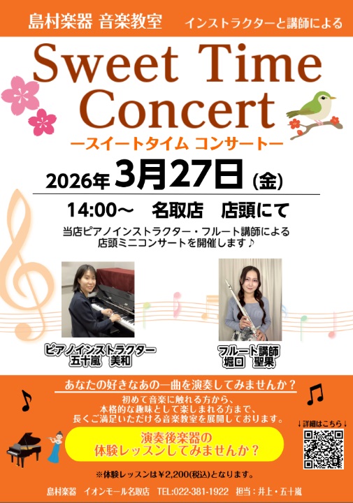 ![少しづつポカポカ陽気な日が増えてきましたが皆様いかがお過ごしでしょうか~?来たる3/27(金)にイオンモール名取の3階にあります島村楽器店内にて爽やかに音楽をお届けいたします♪皆様ご存知の懐かしの音楽やどこかで聞いたことあるあの作品まで・・!当店ピアノインストラクター、フルート講師の演奏を是非お楽し […]](https://www.shimamura.co.jp/shop/natori/wp-content/uploads/sites/112/2026/03/20260316-4a510c91a6a0280b72dc3f333e75ef5f.jpg)