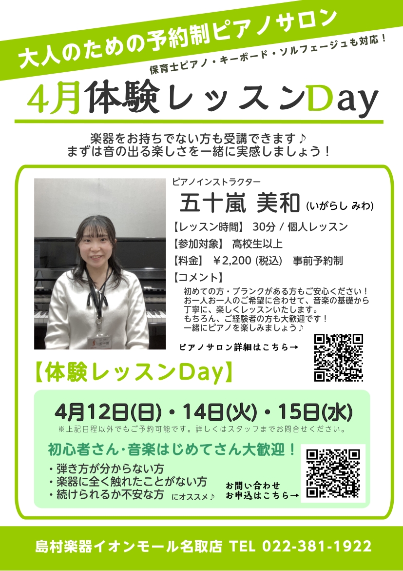 こんにちは!イオンモール名取店ピアノインストラクター 五十嵐です。 高校生以上の方のための予約制レッスンピアノサロンでは「体験レッスンDay」を開催いたいます!土日のおやすみの日、平日の早い時間・遅い時間も受講いただけます。受講しやすいお時間にぜひ受けてみませんか? はじめての方も、久しぶりに再開さ […]