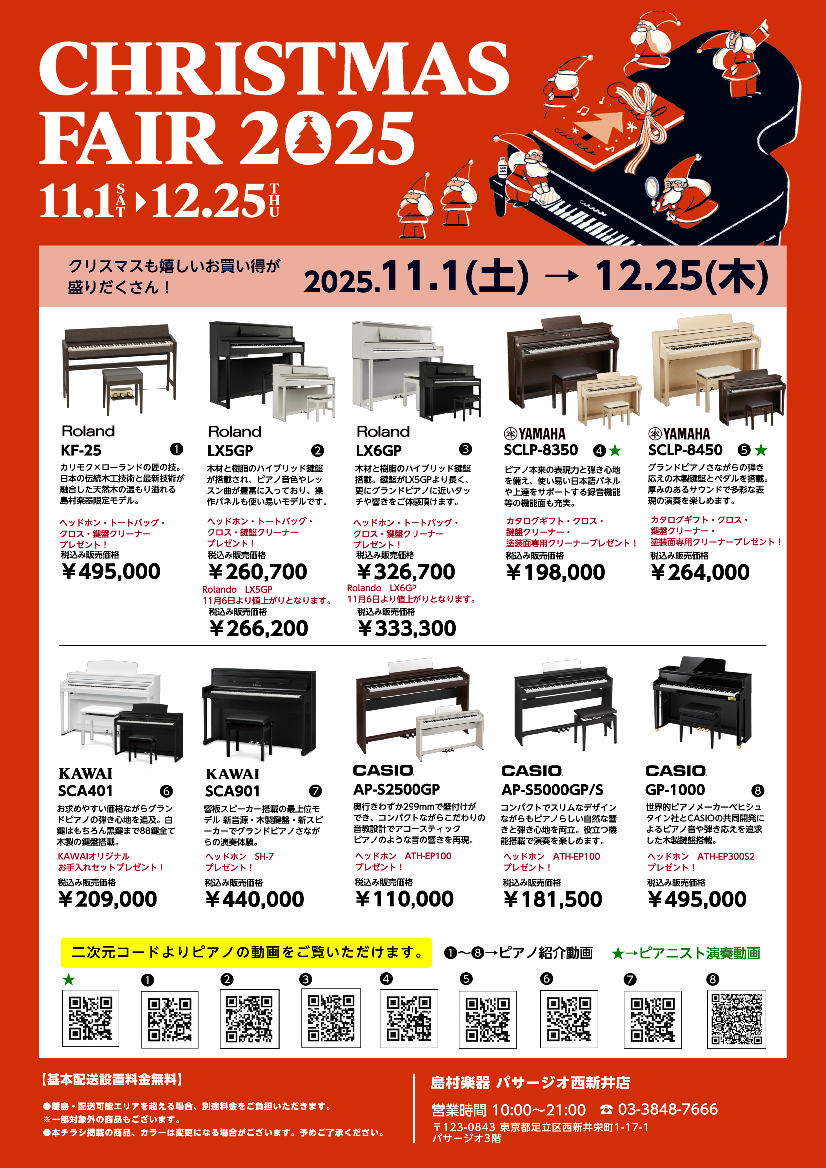 2025年|クリスマスフェア|電子ピアノ|ヤマハ・カワイ・ローランド・カシオの電子ピアノ多数展示中!足立区・荒川区・葛飾区・北区・千住で電子ピアノ選ぶなら西新井店へ!