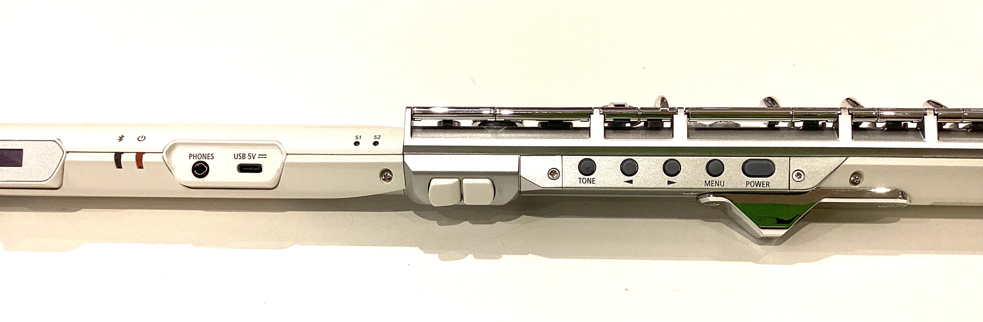 フルートと大きく違う点は、口を当てる所ですね。息を上や、下に吹き込んで音の高さを変えられる設定やオクターブキーで高さを変える設定にしたりと、いろいろカスタマイズできます。