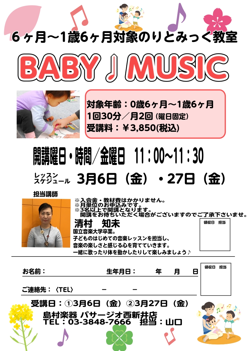 ![0歳6ヶ月から始められる、はじめての音楽体験。「BABY ♪ MUSIC」は、音楽に合わせて体を動かしたり、歌ったりすることで、お子様の「音楽を感じる心」を育てるリトミック教室です。入会金や教材費は不要!月単位で気軽にご参加いただけます。ぜひ親子で楽しい時間を過ごしませんか? CONTENTS0歳で […]](https://www.shimamura.co.jp/shop/nishiarai/wp-content/uploads/sites/140/2025/12/20260102-1baby_pdf_page-0001-1.jpg)