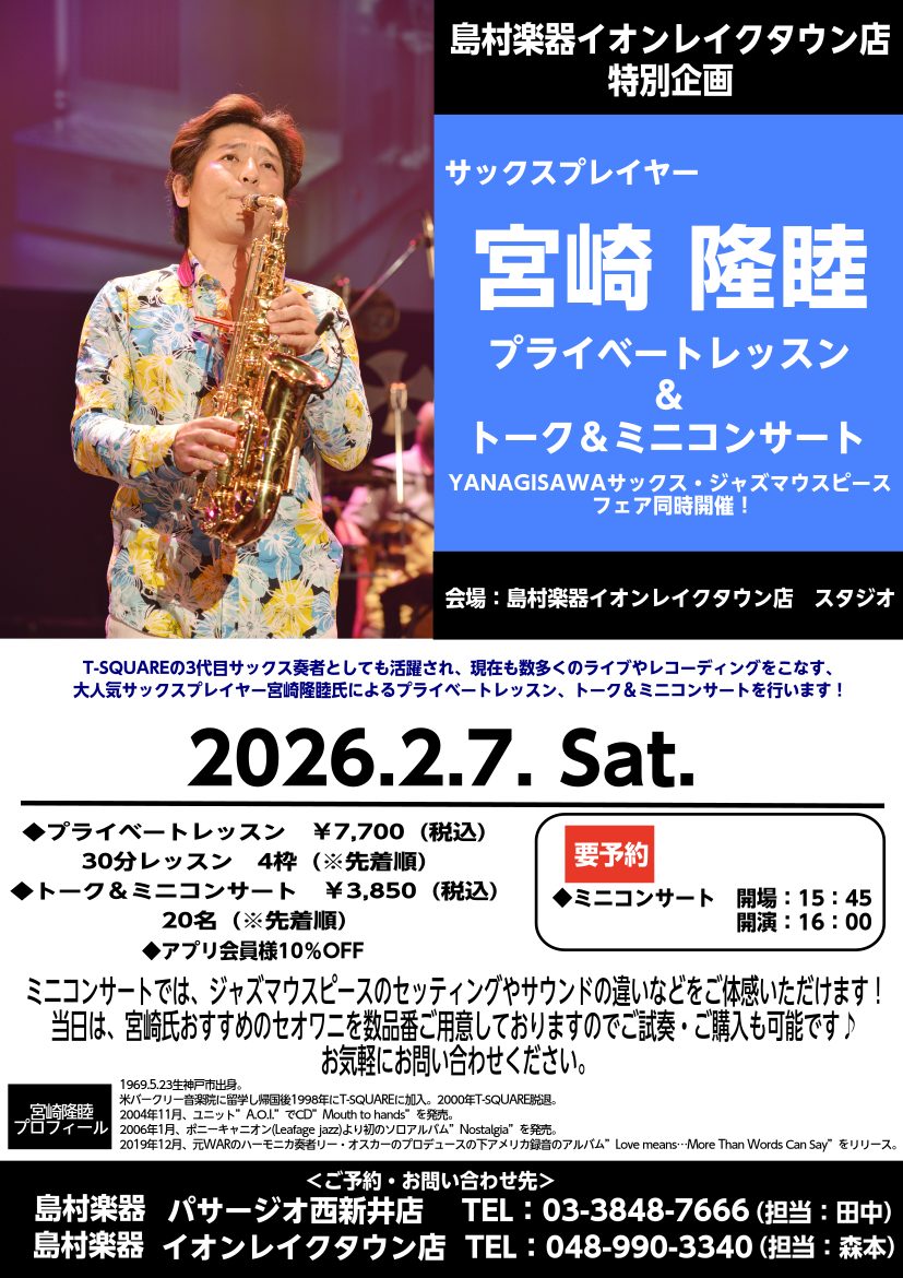 🎷サックス奏者 宮崎隆睦(みやざき たかひろ)氏 を招いた、プライベートレッスン&ミニコンサートを開催します。