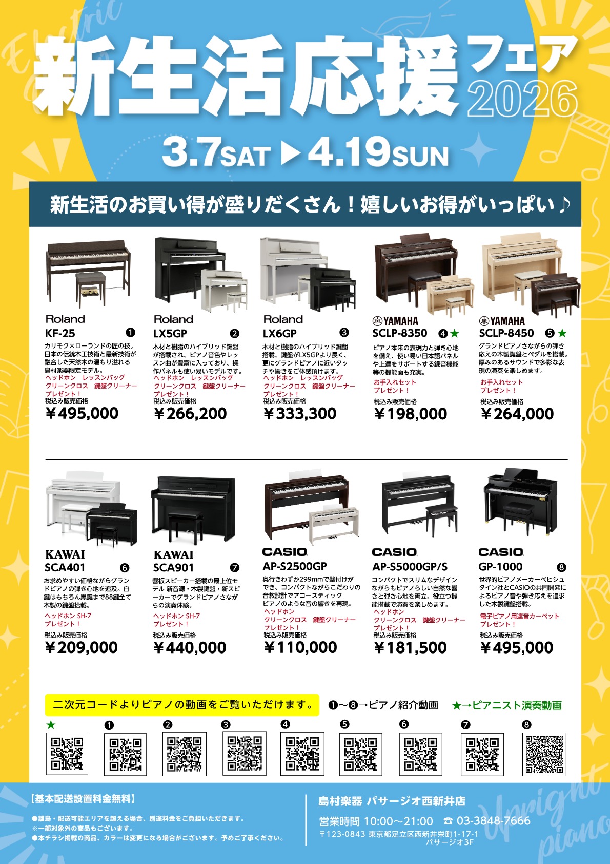 ![CONTENTS電子ピアノを買うならパサージオ西新井店へ!ピアノ担当の入江がご案内いたします!春の新生活応援フェア開催中!当店展示ラインナップ YAMAHA機種一覧当店展示ラインナップ KAWAI機種一覧当店展示ラインナップ Roland機種一覧当店展示ラインナップ CASIO機種一覧特典① 全国へ […]](https://www.shimamura.co.jp/shop/nishiarai/wp-content/uploads/sites/140/2026/04/20260408-b4d455058f21850911d39dd9f4958195.jpg)