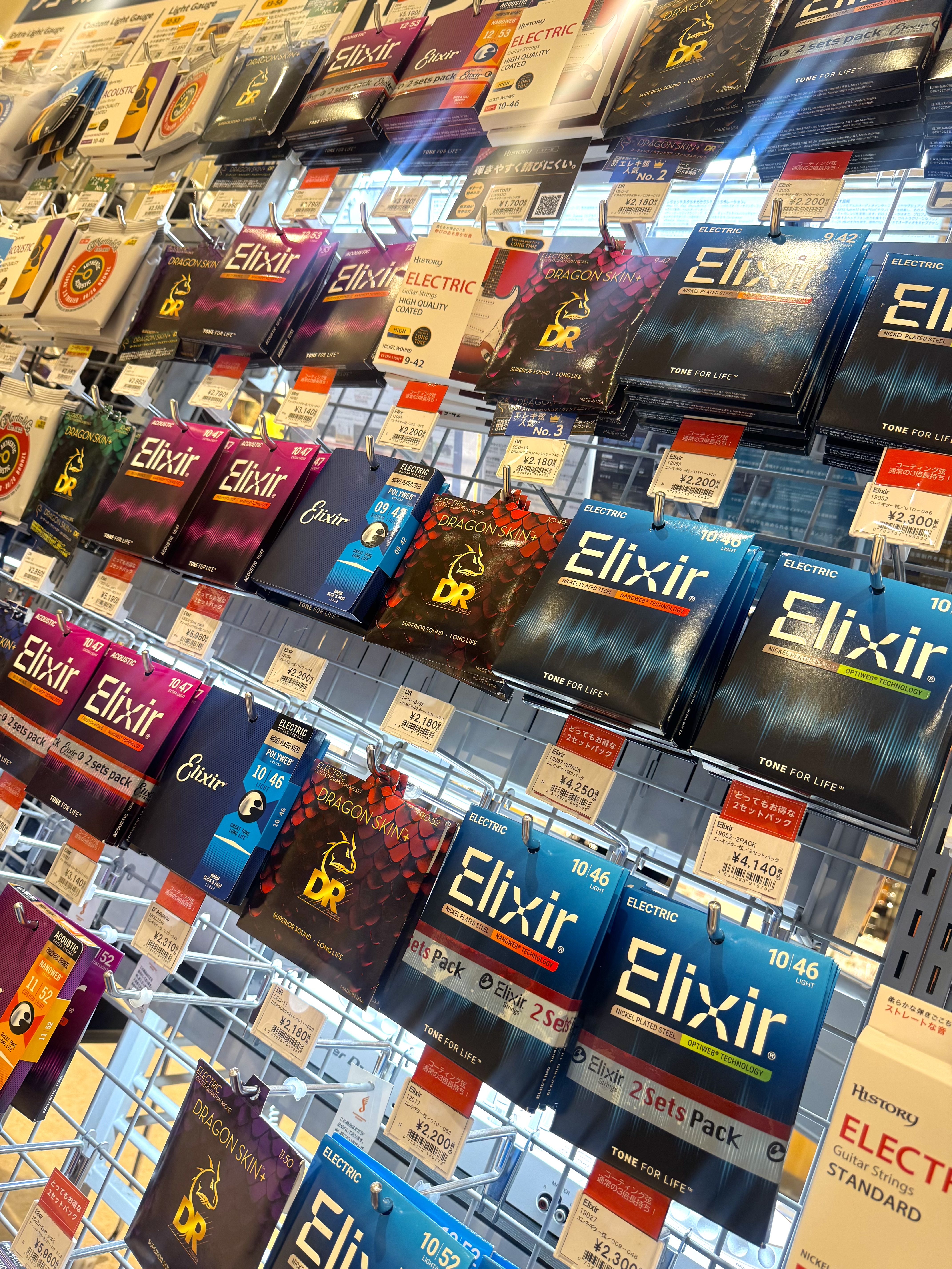 売り場にはメーカーやゲージ(太さ)の違う色々な弦が並んでいます。アコースティックギター(フォークギター)用、クラシックギター用、エレキギター用、エレキベース用等々…