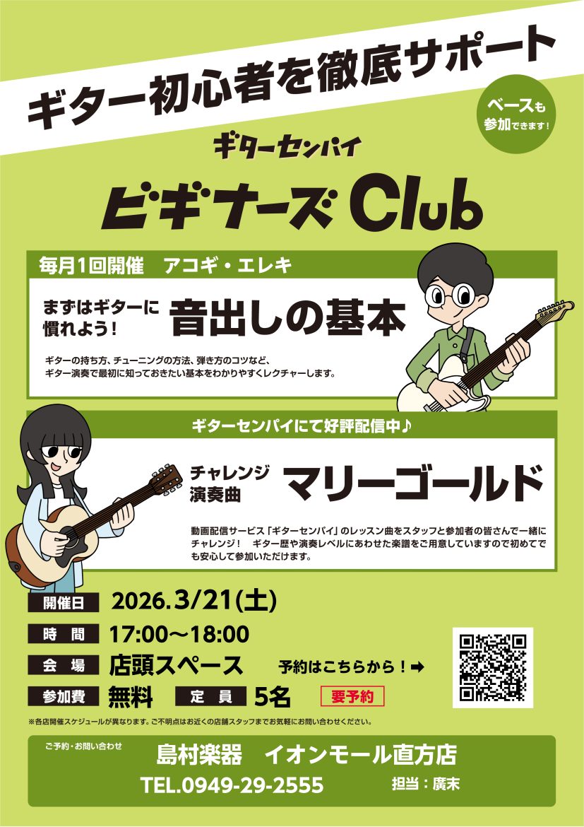 | 3/21(土) | 17:00~18:00 | 島村楽器直方店スタジオ | 無料 |