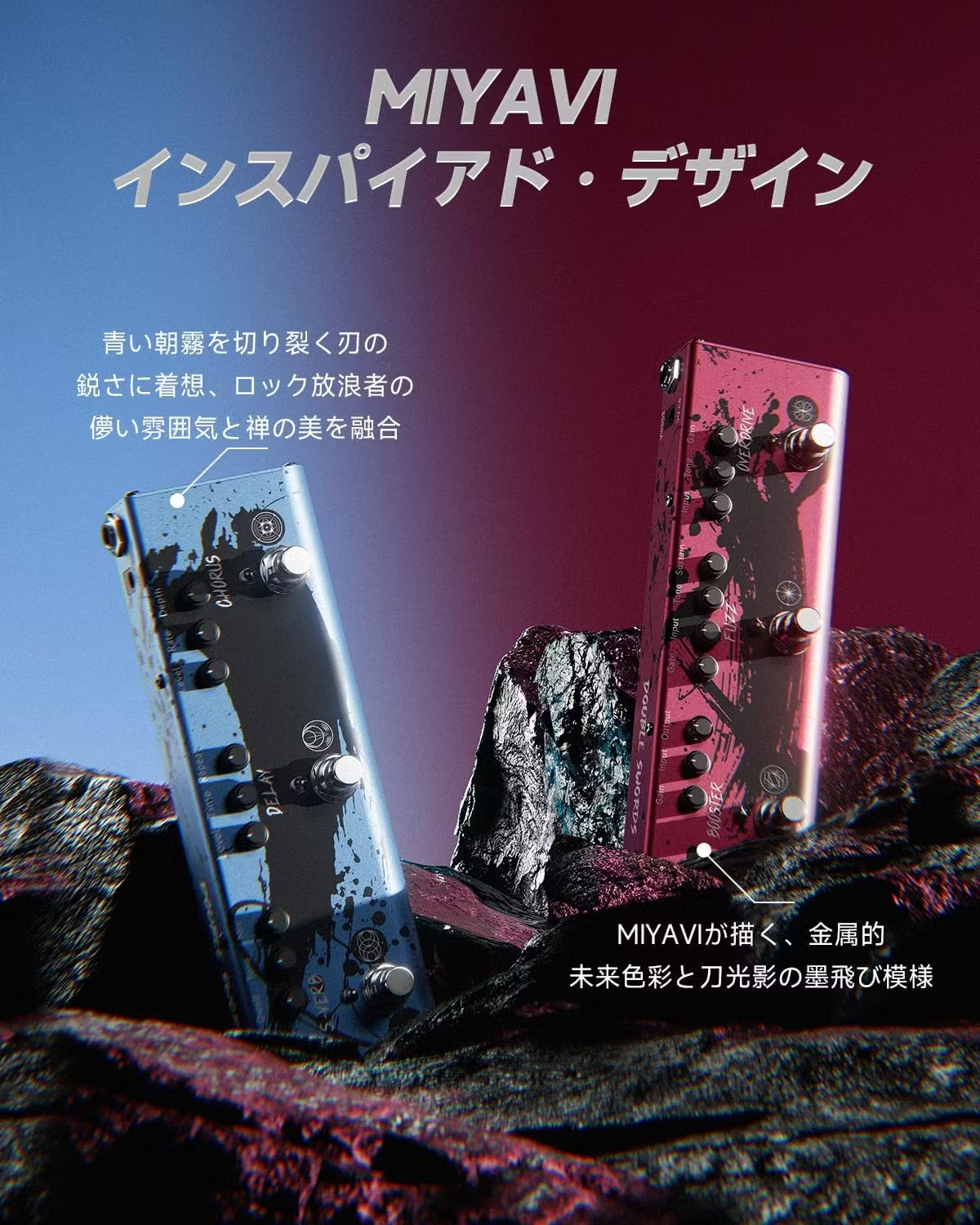 サムライ・ギタリストことMIYAVI氏完全監修のエレキギター用エフェクターペダルのご予約受付を開始いたしました! ラインナップは歪み系と空間系の2種類です♪
