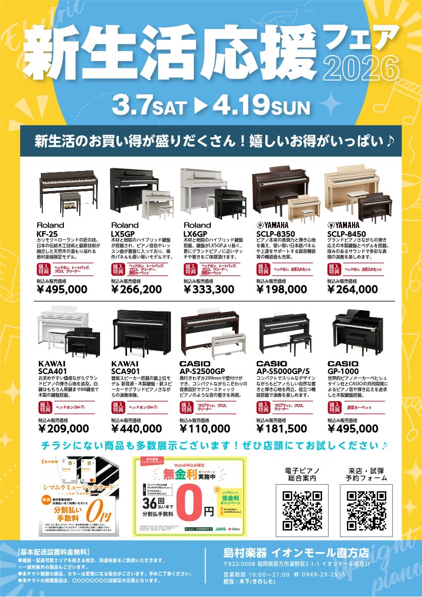 CONTENTS新生活応援フェア2026CASIO 電子ピアノ新生活キャンペーンキャンペーン情報Roland&karimoku 「きよら」KF-25 島村楽器限定モデルCASIO「PX-S1100」限定生産カラー展示中♪展示機種ご紹介本体と同時購入でお得!ピアノ補助台ご予約・お問い合わせ新生活応援フ […]