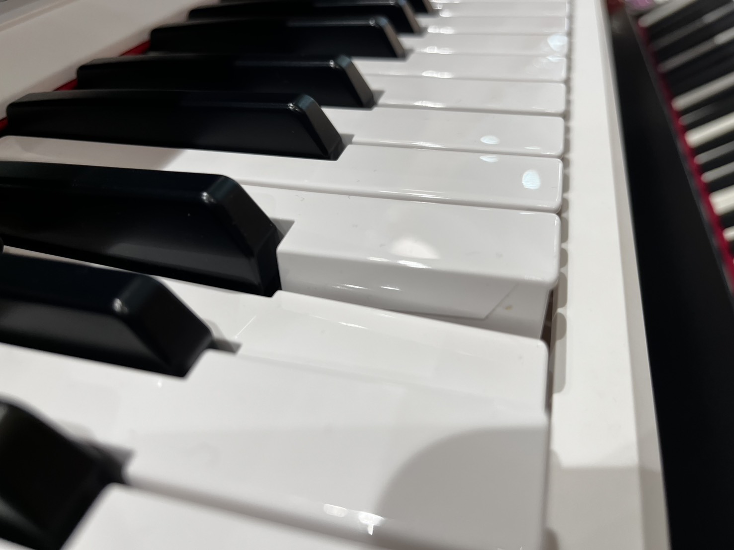 画像をご覧いただくと分かるように樹脂鍵盤(プラスチック)を搭載しているのです。