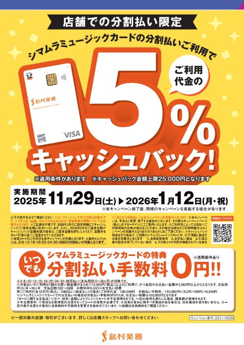 シマムラミュージックカード(SMC)の分割払いご利用で買い上げ金額の5%が返ってくるお得なキャンペーン!