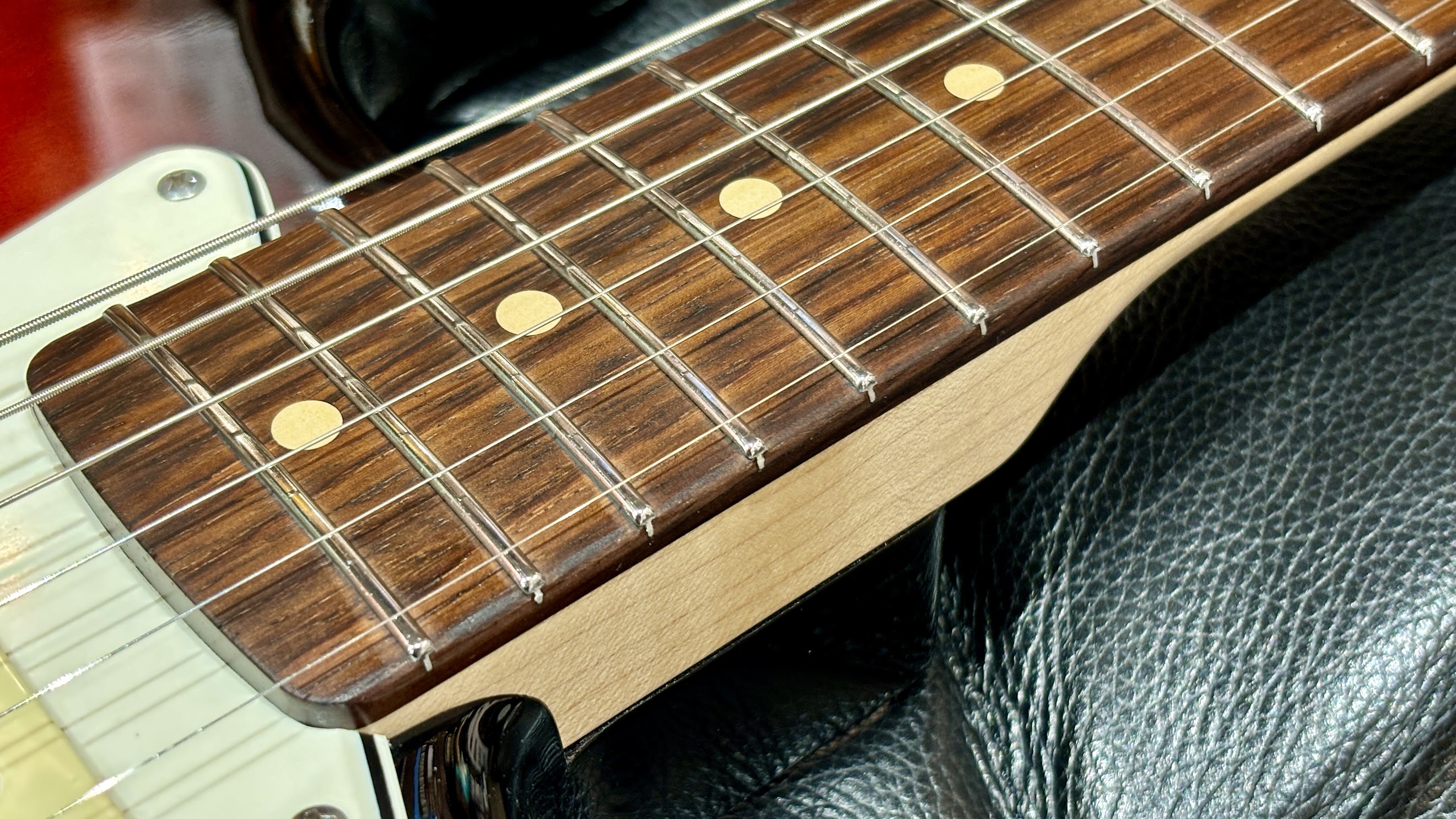 ネックはメイプル、指板にはローズウッドを採用。ここで注目すべきは、指板のR(カーブ)である。184mm(7.25インチ)Rという仕様は、伝説的なヴィンテージギターと同じセッティング。21フレット構成により、握った瞬間に「これだ」と感じる、手に馴染むグリップ感を実現した。