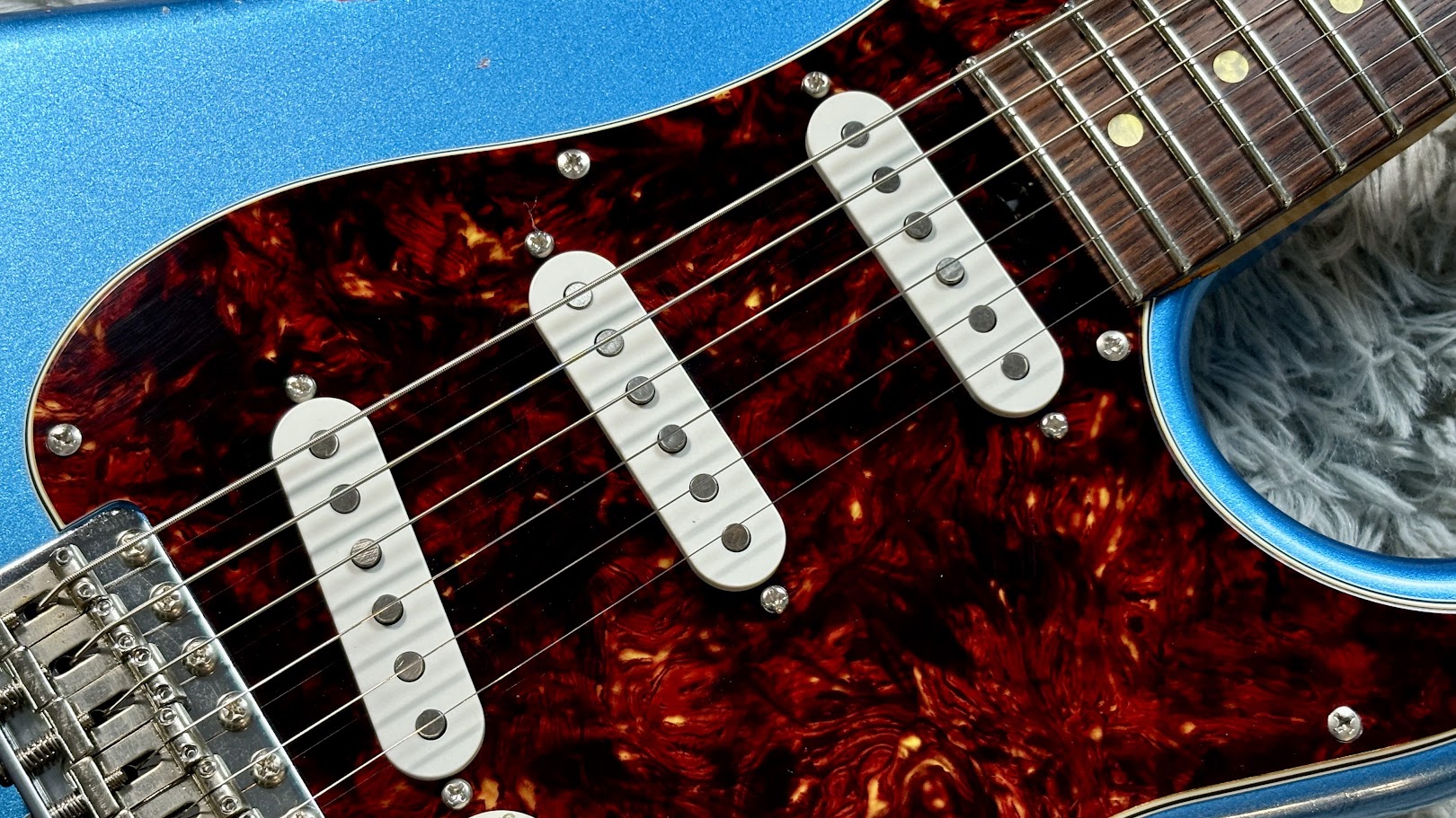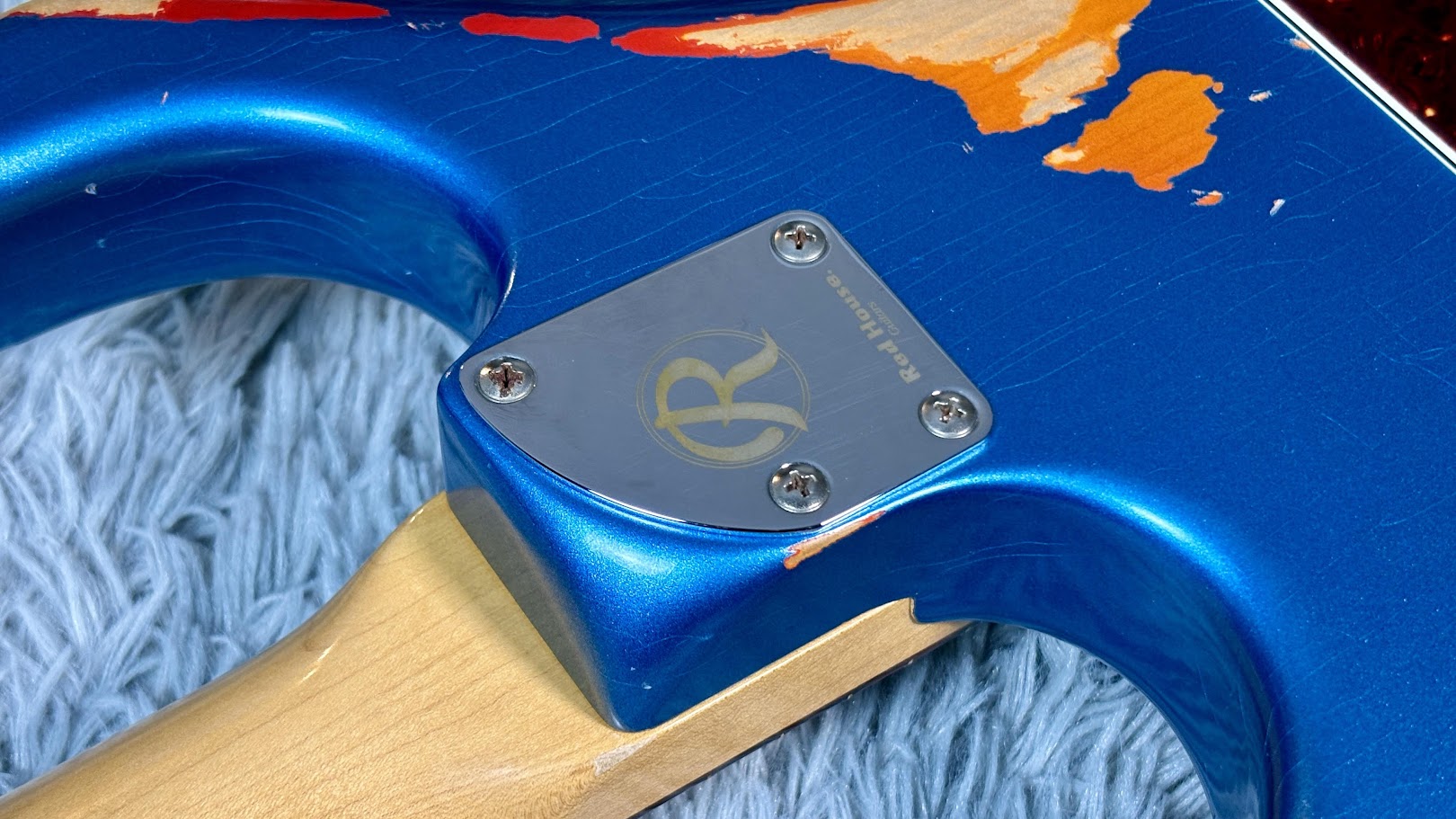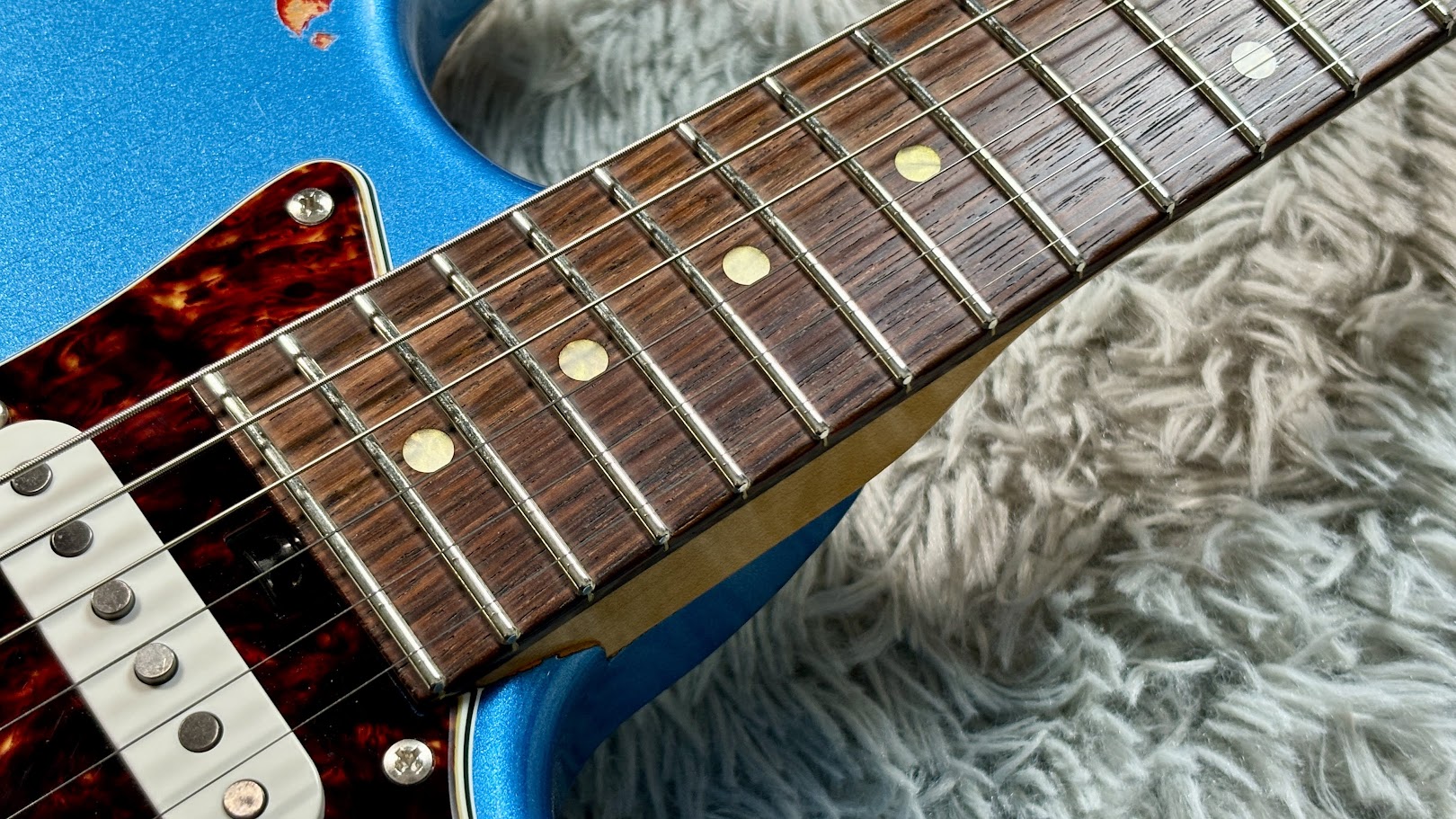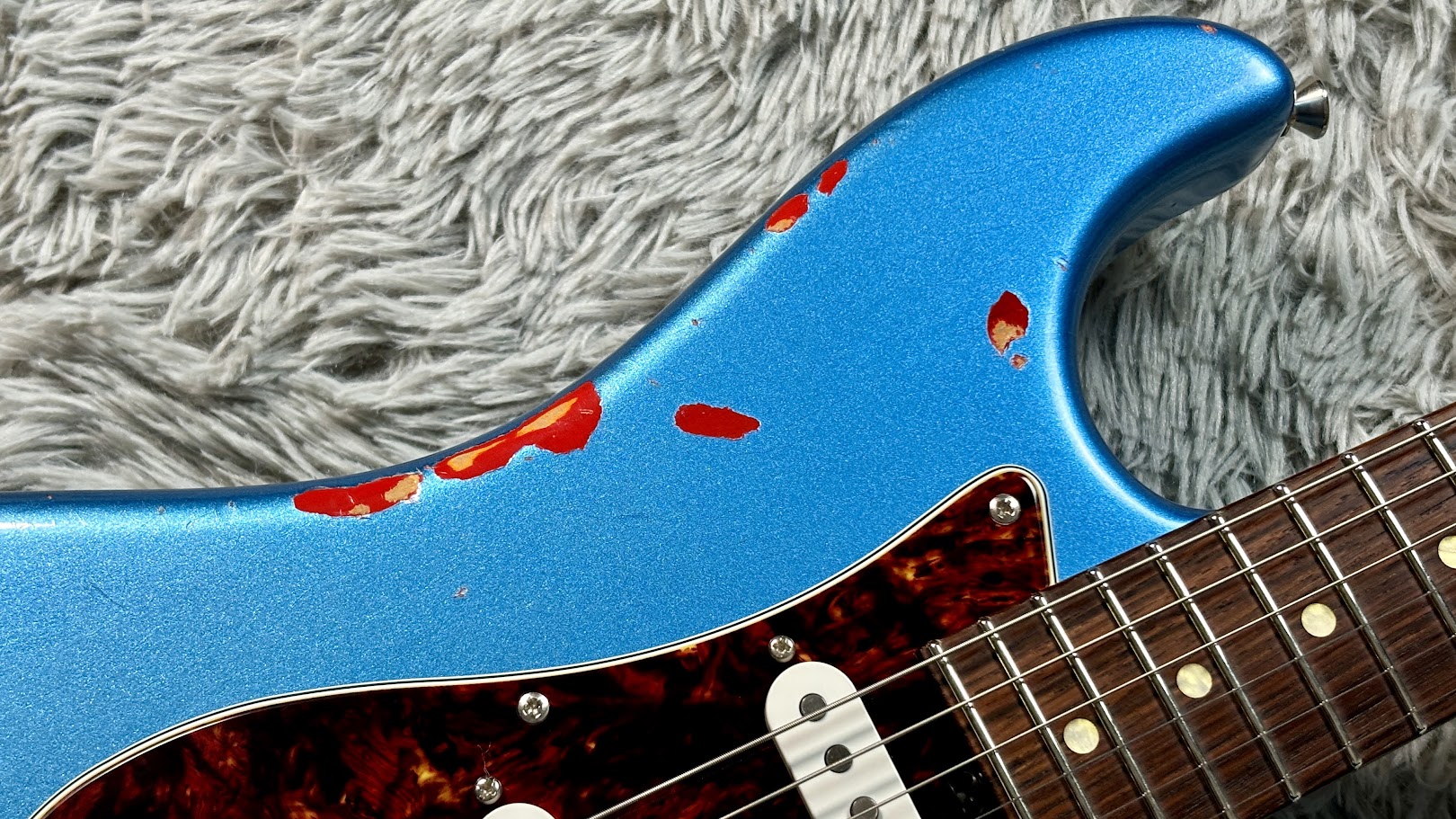 下地となる「3-Tone Sunburst」の上に、鮮やかな「Lake Placid Blue」を重ねたマルチレイヤー仕様。そこに、長年過酷なステージを生き抜いてきたかのようなヘヴィエイジド加工が施されている。