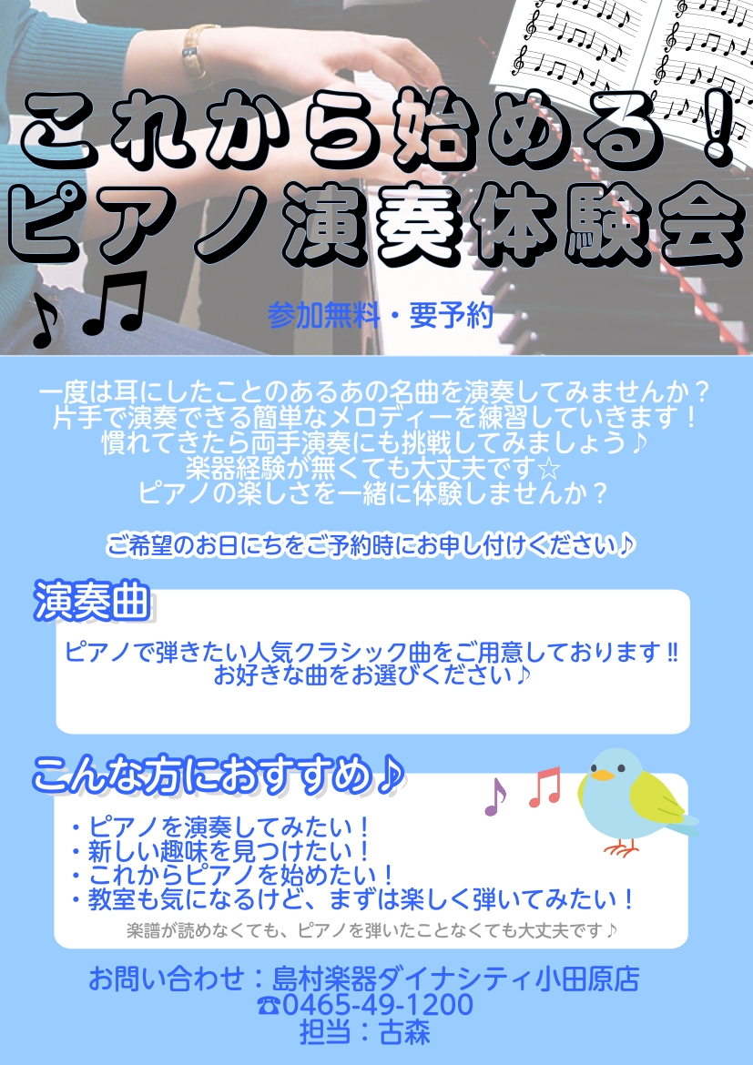 ![皆様こんにちは🌷小田原店電子ピアノ担当の古森(こもり)です❕ 現在、島村楽器ダイナシティ小田原店ではピアノフェアを開催中でございます✨4/20(月)~6/28(日)までの期間中に対象商品をご成約いただいた方へ、役立つ便利アイテムをプレゼント👀✨ お得にピアノを始められる機会ですので、検討中の方はぜひ […]](https://www.shimamura.co.jp/shop/odawara/wp-content/uploads/sites/214/2026/04/20260410-20260331-b4d455058f21850911d39dd9f4958195.jpg)