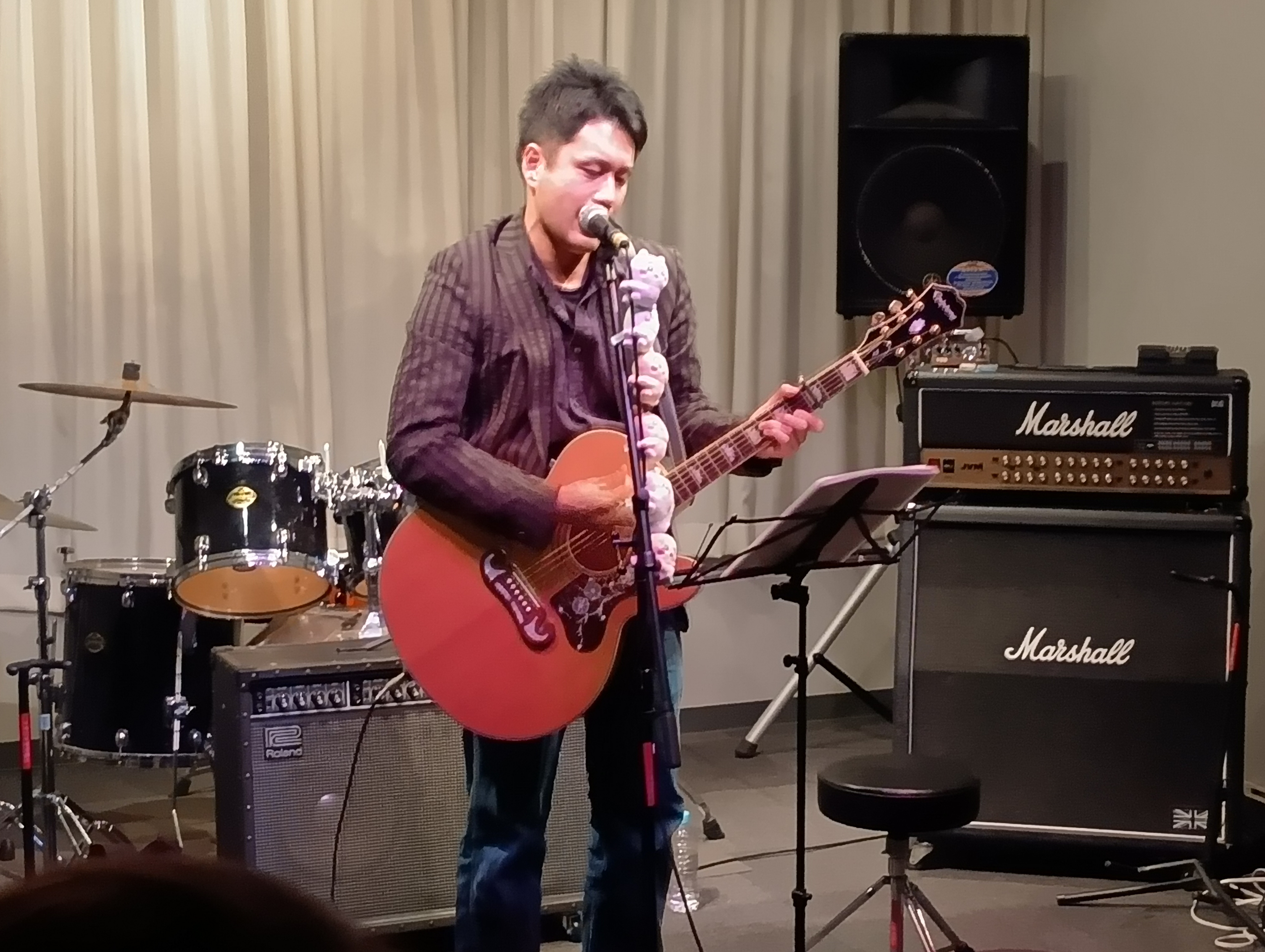 続きましてヨシムラさんはギターの弾き語り!ほどよい緊張感と高揚感のあるステージを披露してくれました!エレキギターで弾き語りもありですね!