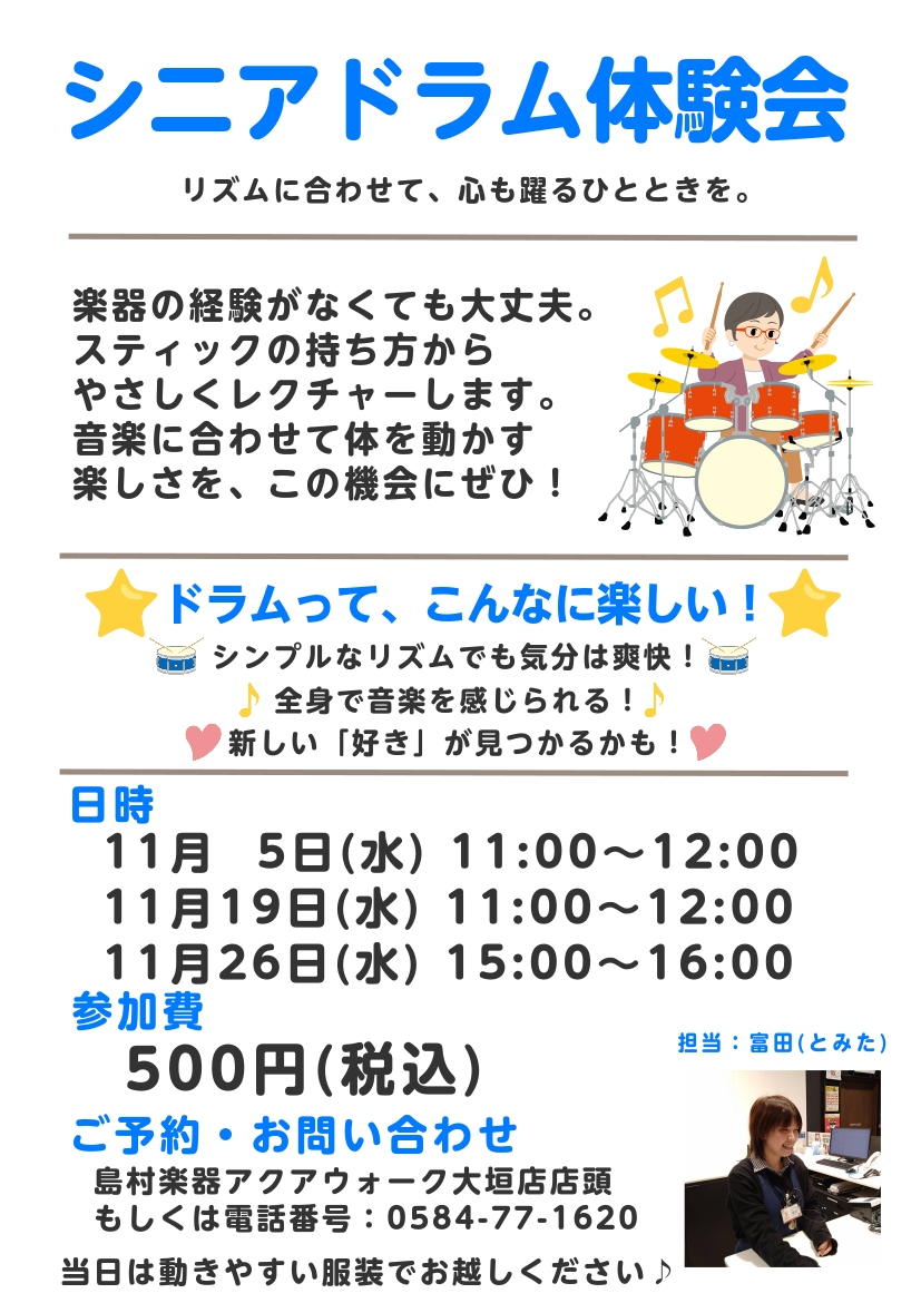 CONTENTSシニアドラム体験会、始めます!日程(要予約)費用シニアドラム体験会、始めます! 手足を同時に動かして、リズムを刻むドラム、やってみたい!と思ったことはありませんか?また、始めるのに躊躇して、なかなか機会がないとあきらめていませんか? 👧「リズム感がなくて…」👨「楽器を触ったことがない […]