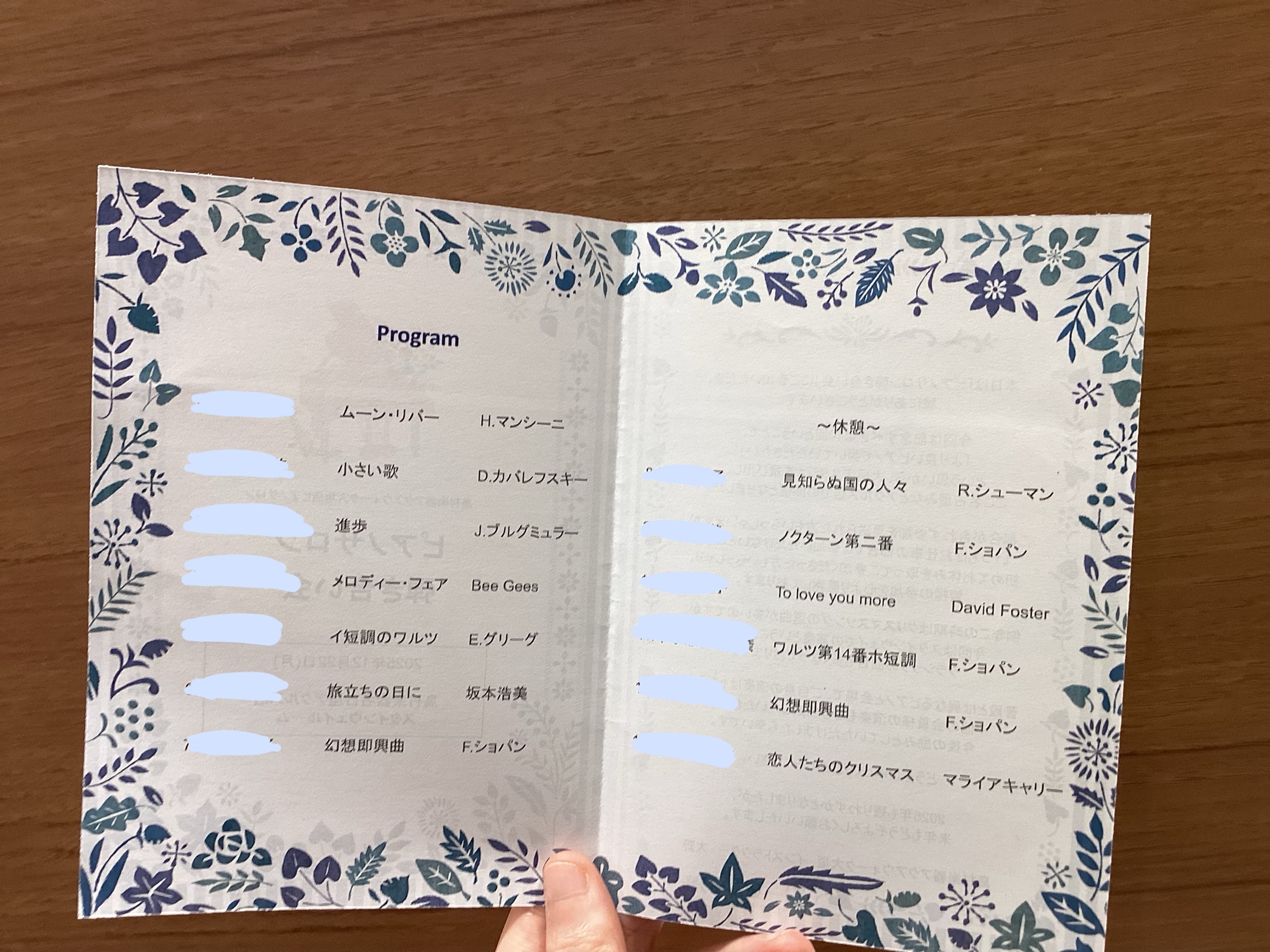 本日のプログラムです。グランドピアノで弾けるということで、クラシック曲が多めのプログラムとなりました。