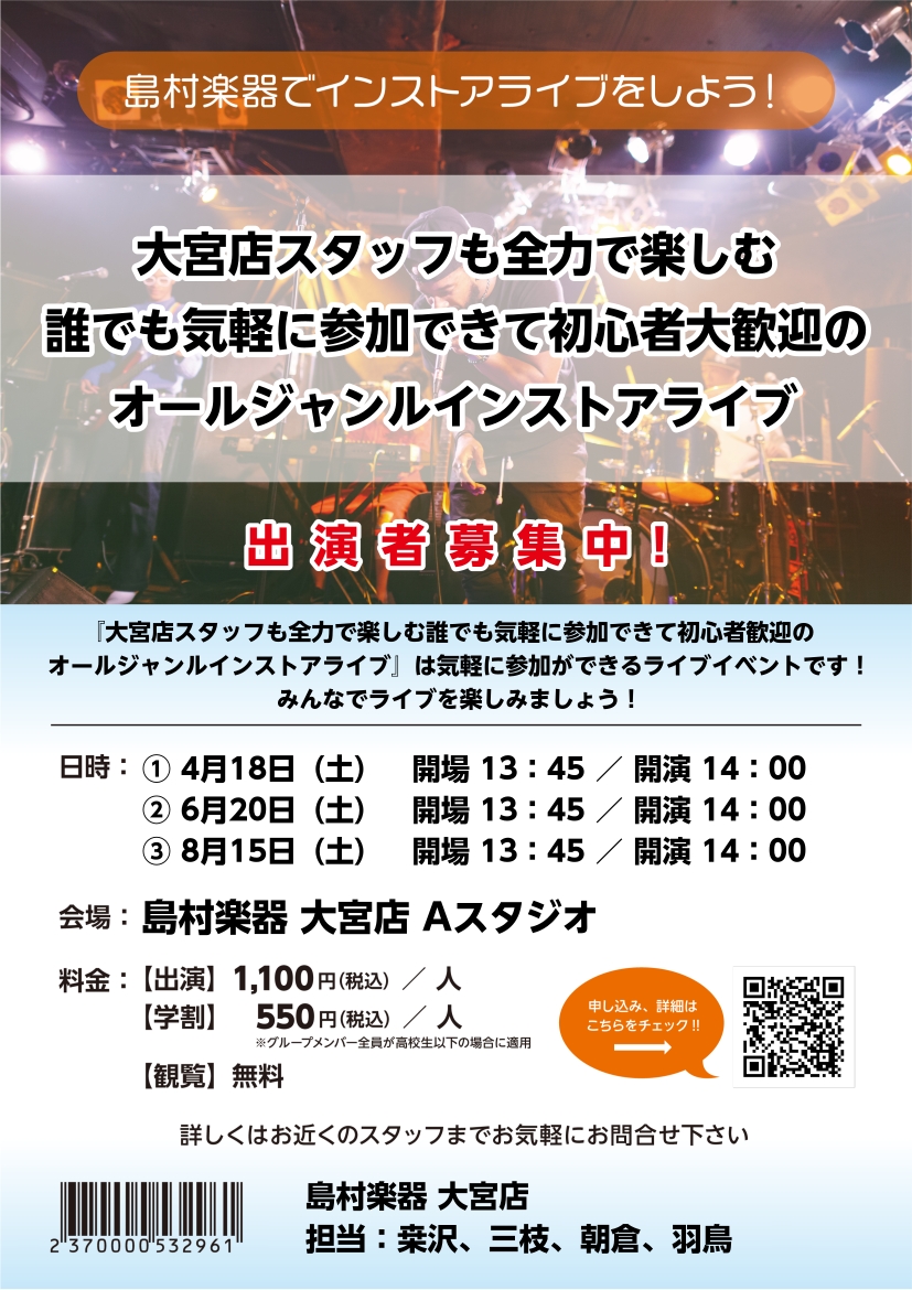 『大宮店スタッフも全力で楽しむ誰でも気軽に参加出来て初心者大歓迎のオールジャンルインストアアライブ』出演者募集中! 皆さん、こんにちは!島村楽器大宮店では「大宮店スタッフも全力で楽しむ誰でも気軽に参加出来て初心者大歓迎のオールジャンルインストアアライブ」を2ヶ月に1度開催しています!参加形態、演奏ジ […]