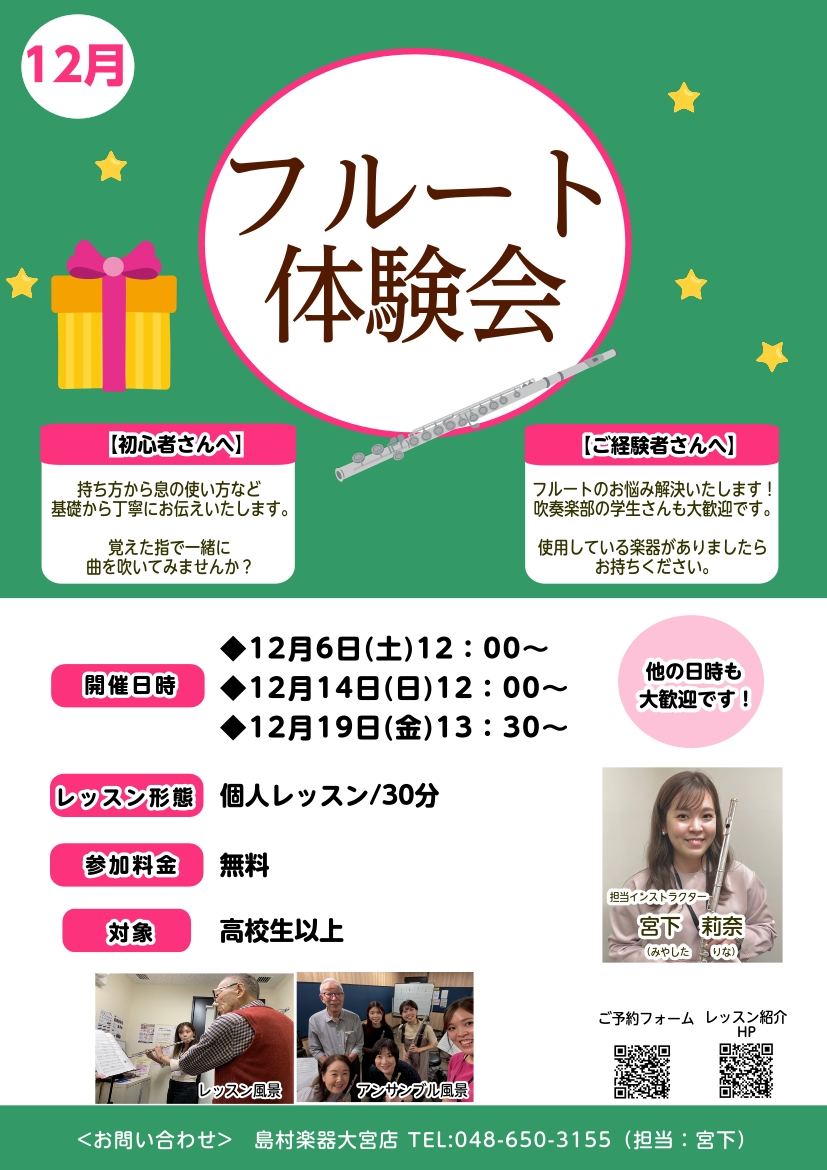 ![こんにちは!フルートインストラクターの宮下です。 はじめての方大歓迎!今年最後のフルート体験会開催いたします(^▽^)/ 楽器初めての方でもご安心いただける体験会です!持ち方や吹き方から丁寧にお教えいたします♪新しい趣味にいかがでしょうか✨ お気軽にお問い合わせください! CONTENTS概要担当イ […]](https://www.shimamura.co.jp/shop/ohmiya/wp-content/uploads/sites/25/2025/11/20251123-e2b57cc9e6d632052cc1abecad1e790b.png)
