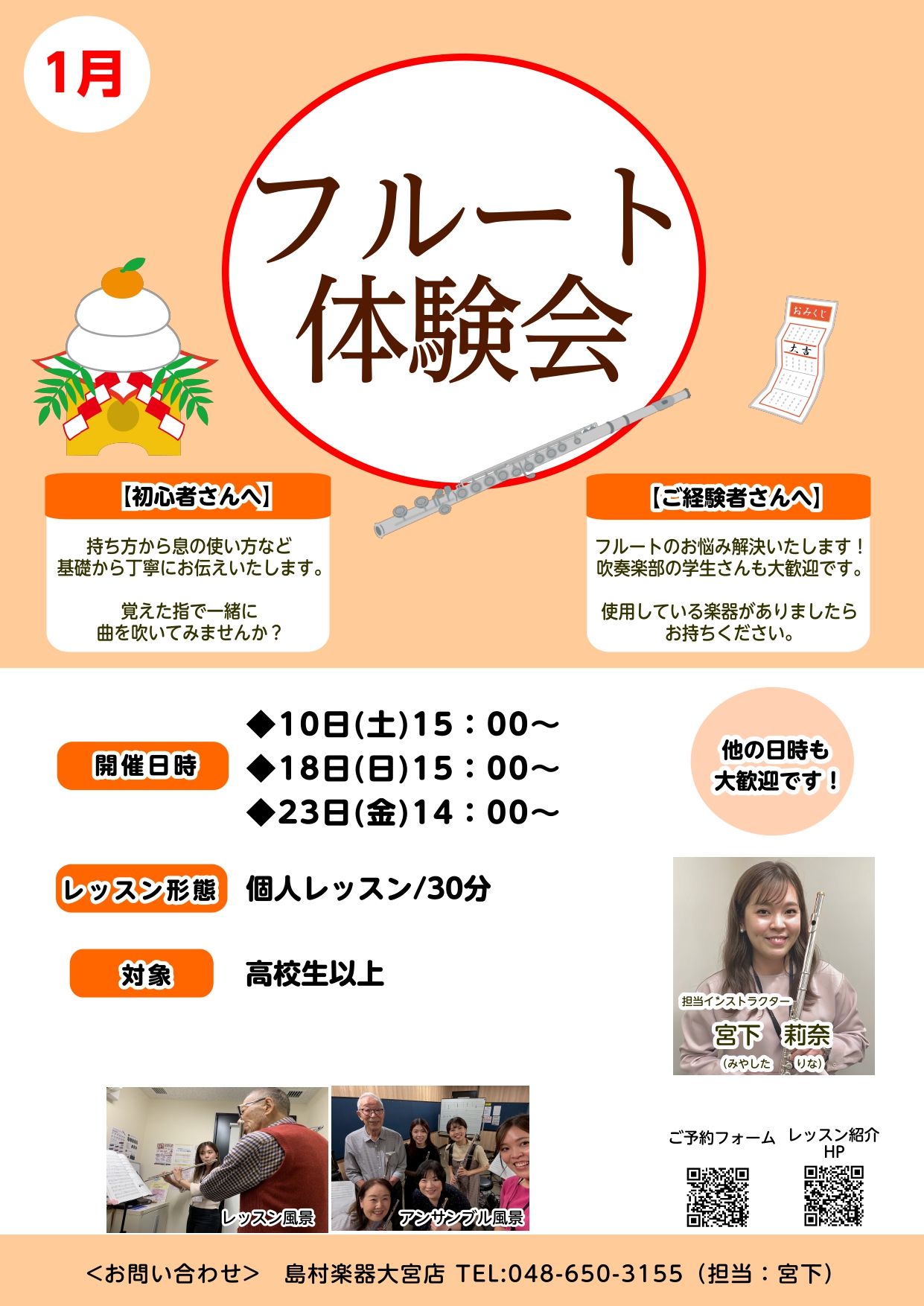 ![こんにちは!フルートインストラクターの宮下です。新年明けましておめでとうございます(^▽^)/ 今年もフルート体験会を毎月開催していきます! 楽器初めての方でもご安心いただける体験会です!持ち方や吹き方から丁寧にお教えいたします♪新しい趣味にいかがでしょうか✨ お気軽にお問い合わせください! CON […]](https://www.shimamura.co.jp/shop/ohmiya/wp-content/uploads/sites/25/2026/01/20251214-fccc2b4ac9cd71904395042cd0f3fd92-1.png)
